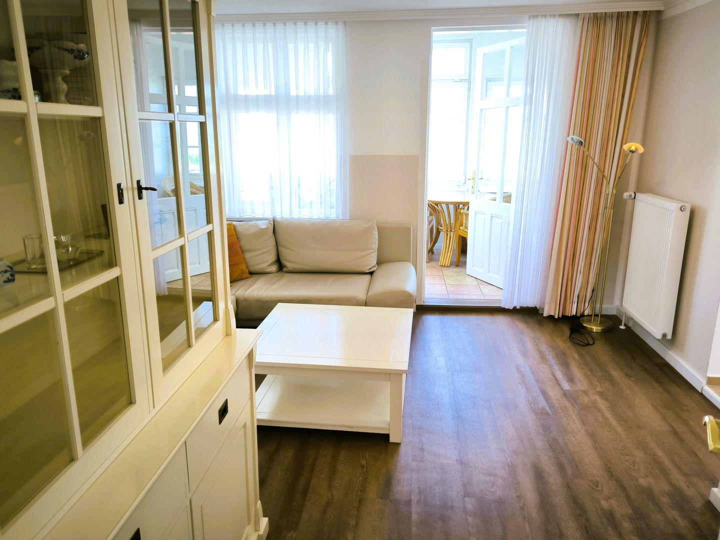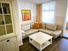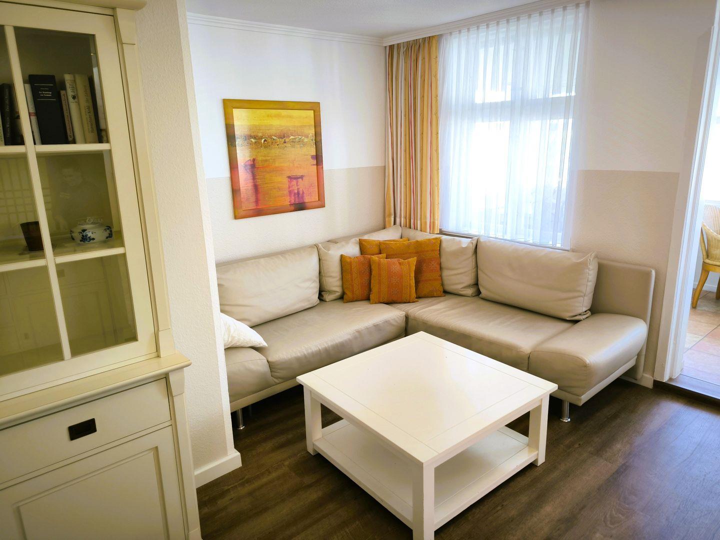 Wohnbereich mit moderner Wohnlandschaft, ausziehbarer Couch, Couchtisch, LED-TV, Radio