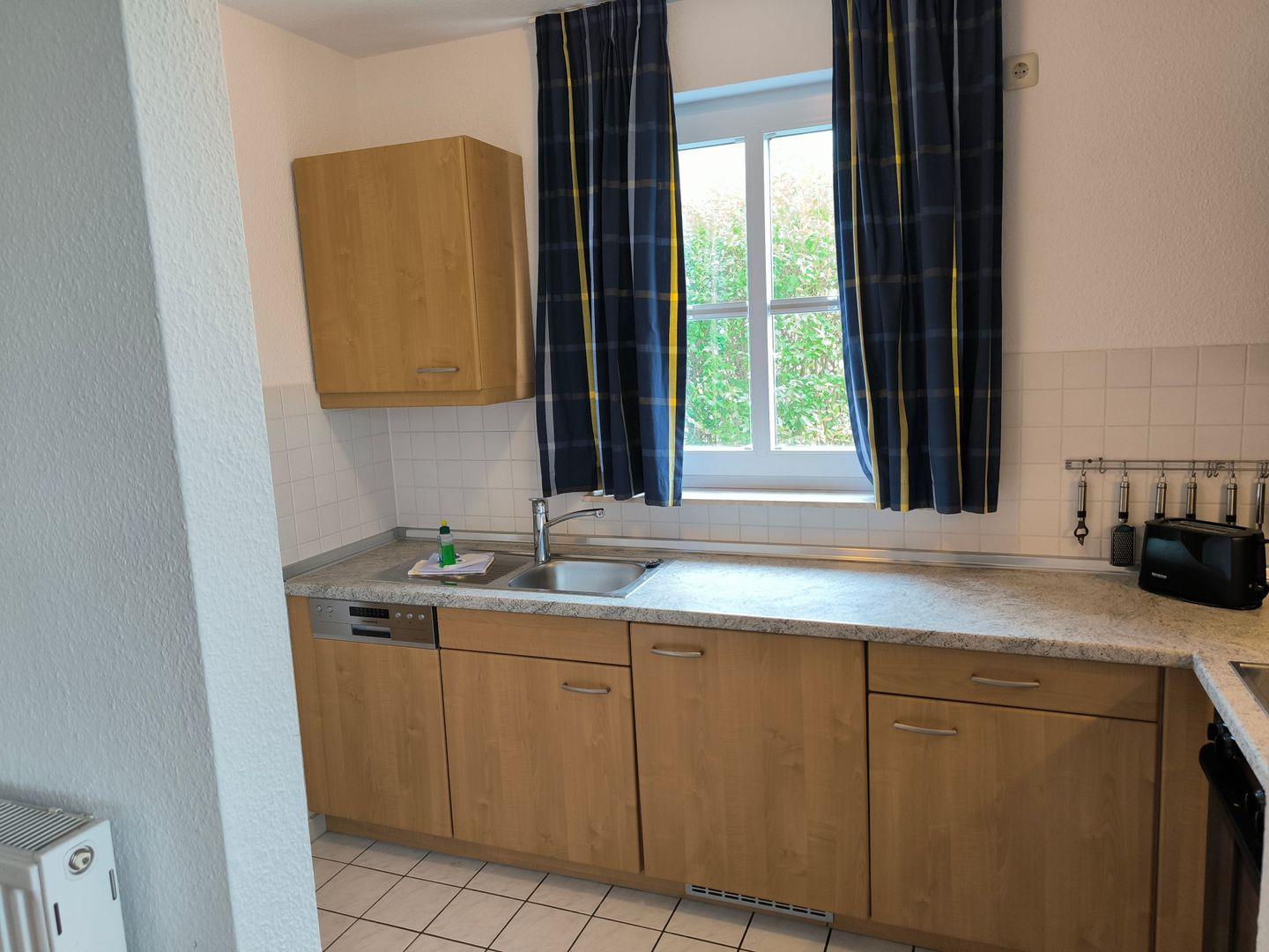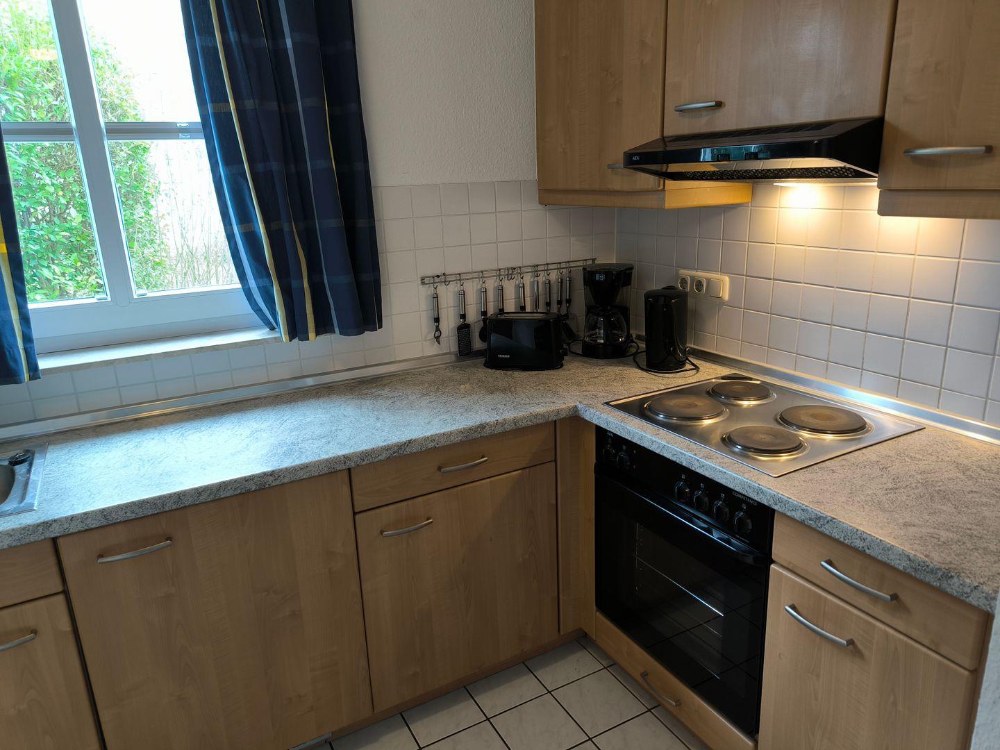 Im Wohnraum integrierte Einbauküche mit: 4-Platten-Kochfeld, Backofen, Kühlschrank mit Gefrierfach, Geschirrspüler, Toaster, Kaffeemaschine, Wasserkocher und Küchenutensilien