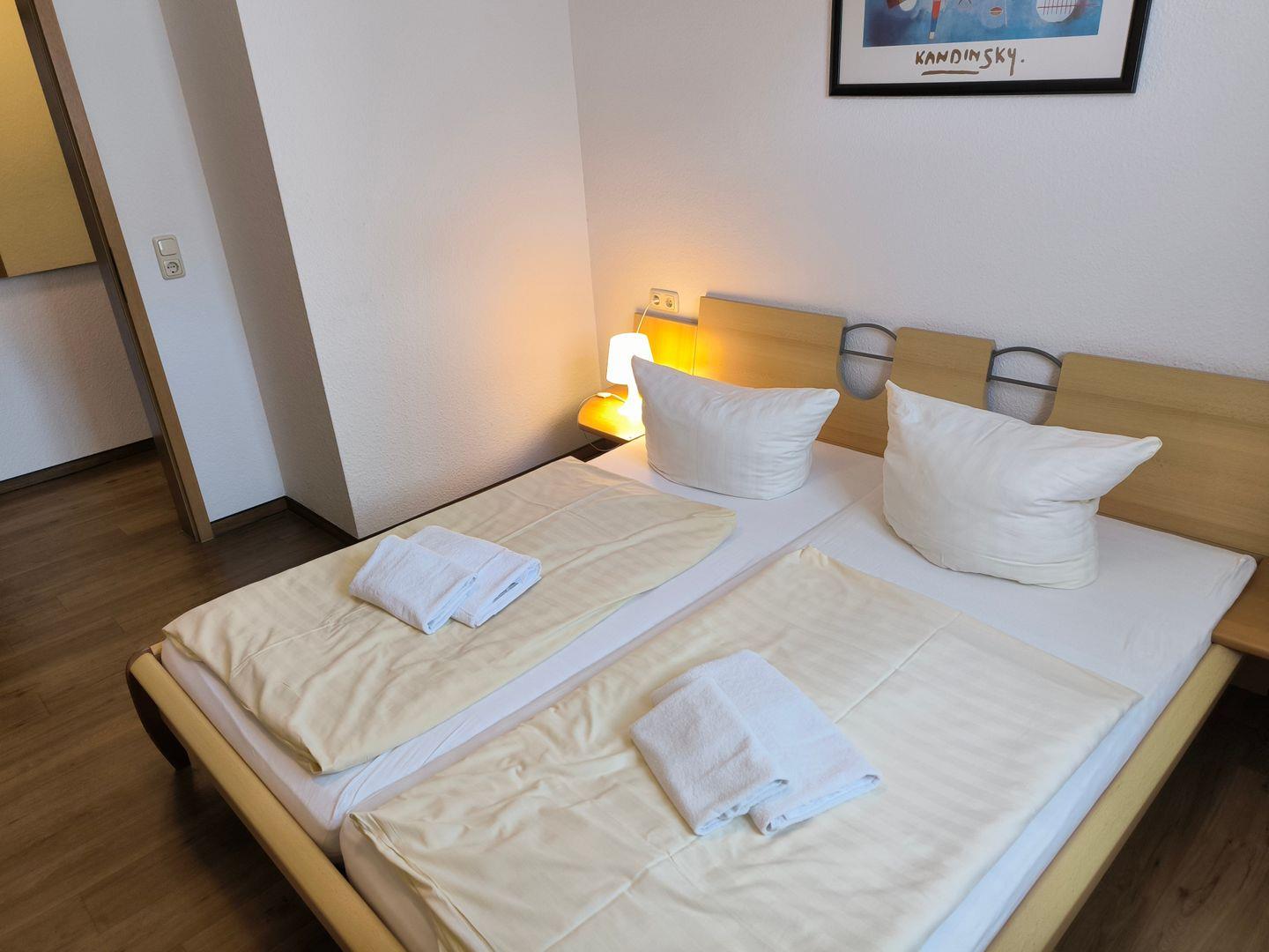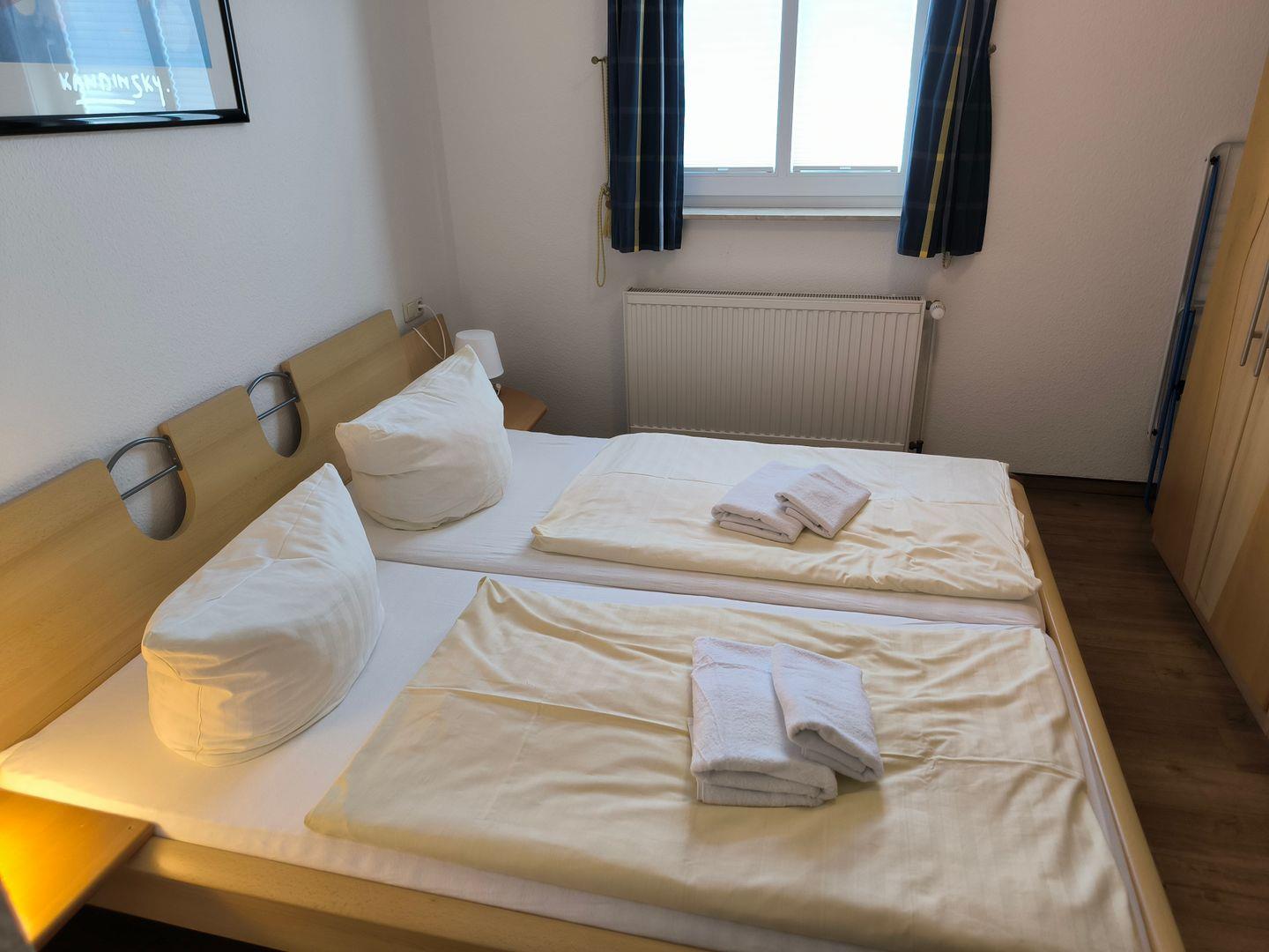 Schlafzimmer mit einem Doppelbett (180 x 200 cm) und großem Kleiderschrank, Kofferablage