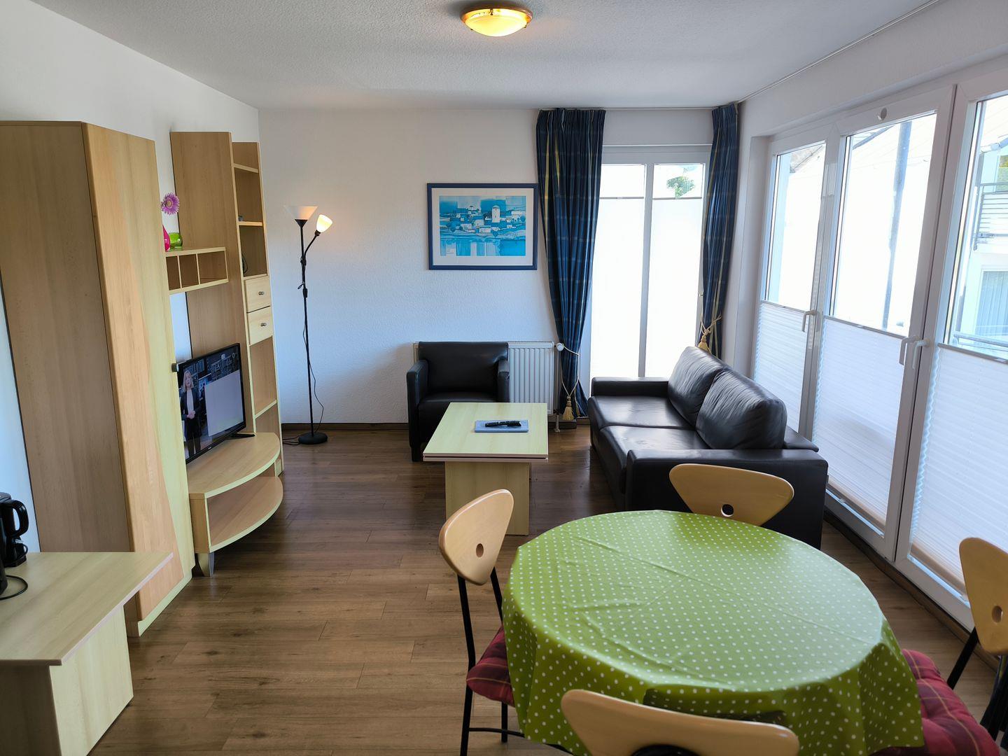 Wohnbereich mit ausziehbarer, moderner Doppelbettschlafcouch, Couchtisch mit Sesseln, TV mit Radiofunktion, Essbereich mit 4 Stühlen