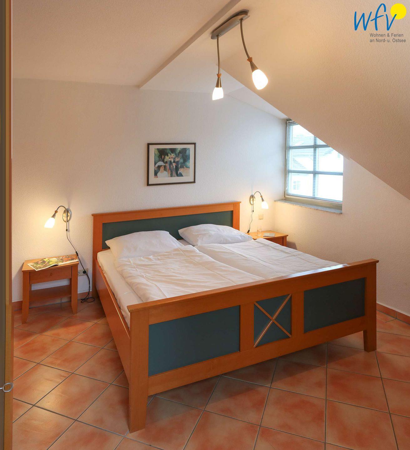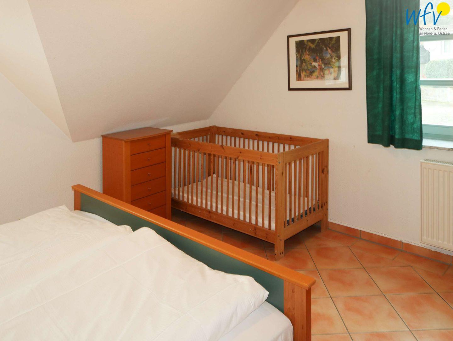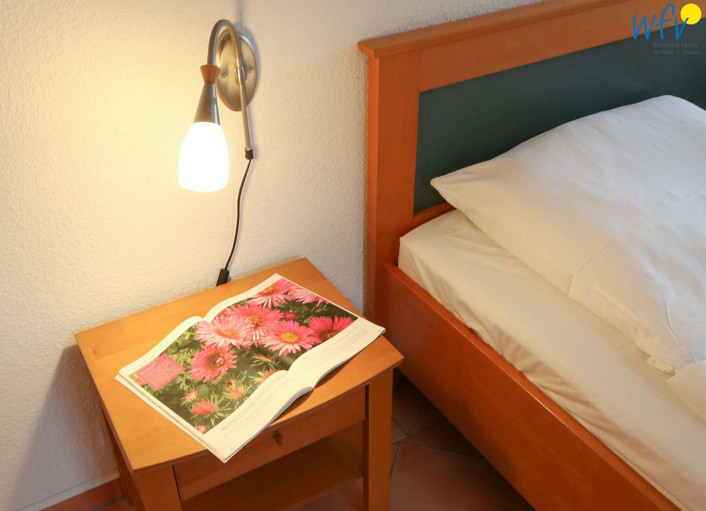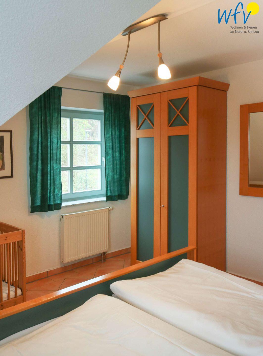 In dem separaten Schlafzimmer der Ferienwohnung auf Rügen befindet sich ein Doppelbett (90 x 180 cm). Die Schlafcouch im Wohnzimmer bietet Platz für eine weitere Person. Ein Kinderbett gehört zum festen Inventar (69 x 140 cm)