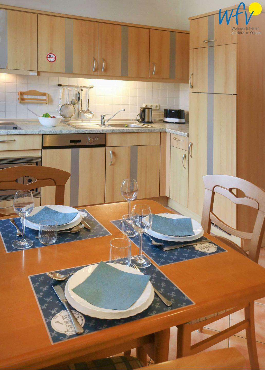 Damit Sie sich in Ihrem Urlaub bequem selbst verpflegen können, verfügt die Küchenzeile u.a. über einen Ceranherd mit Dunstabzugshaube, eine Mikrowelle, eine Spülmaschine und einen Kühl- und Gefrierschrank sowie über eine Kaffeemaschine und einen Wasserkocher.