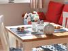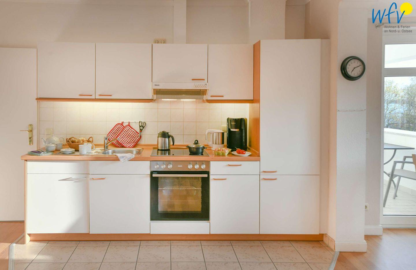 Für eine bequeme Selbstverpflegung ist die Küchenzeile der Ferienwohnung u.a. mit einem 4-Plattenherd, Backofen und Kühlschrank mit Gefrierfach sowie Kaffeemaschine, Wasserkocher und Toaster ausgestattet.