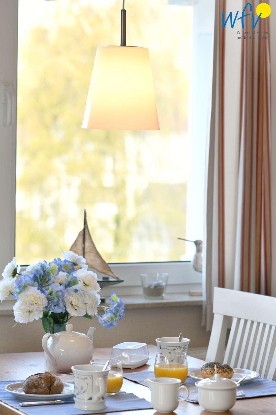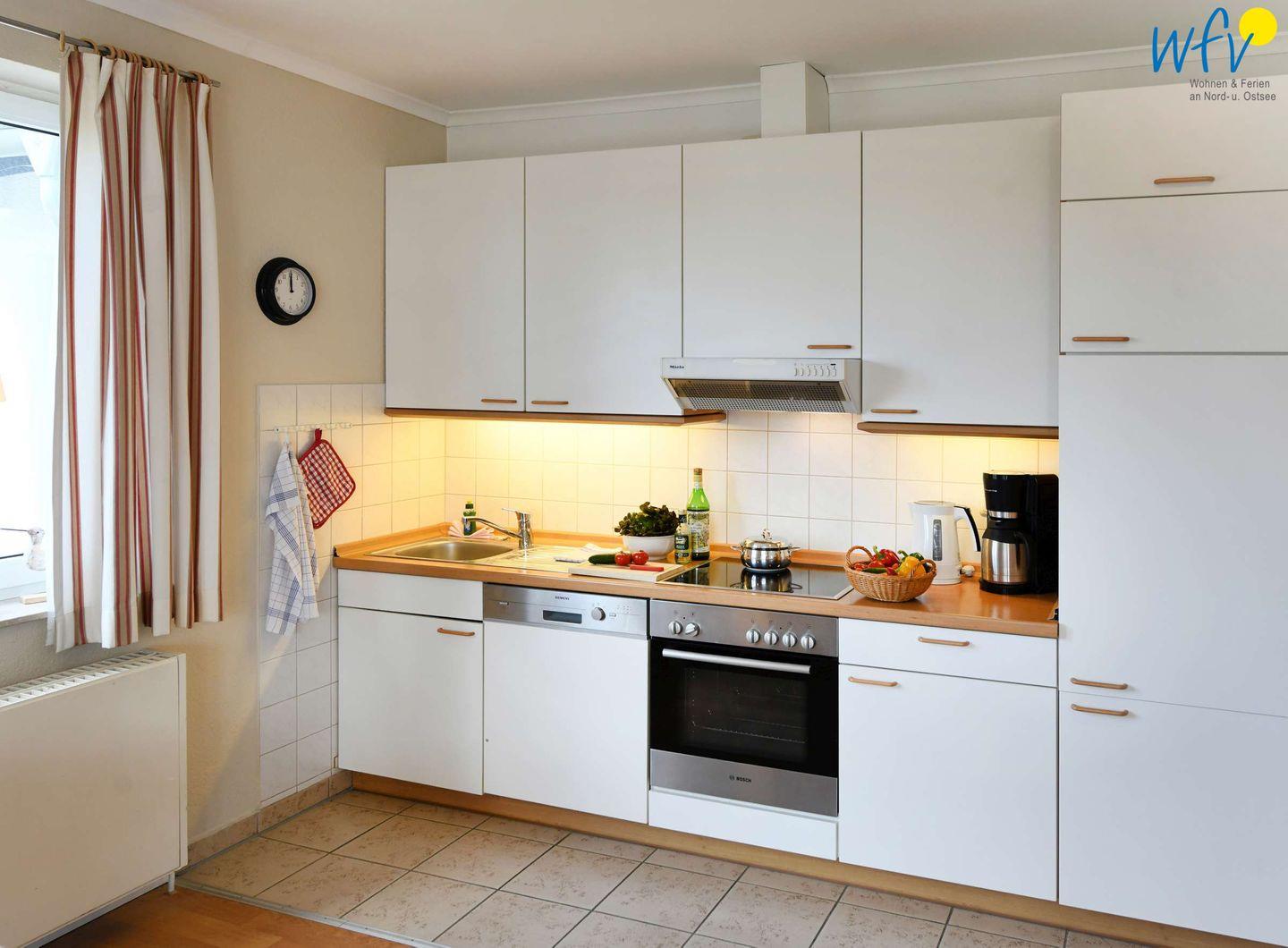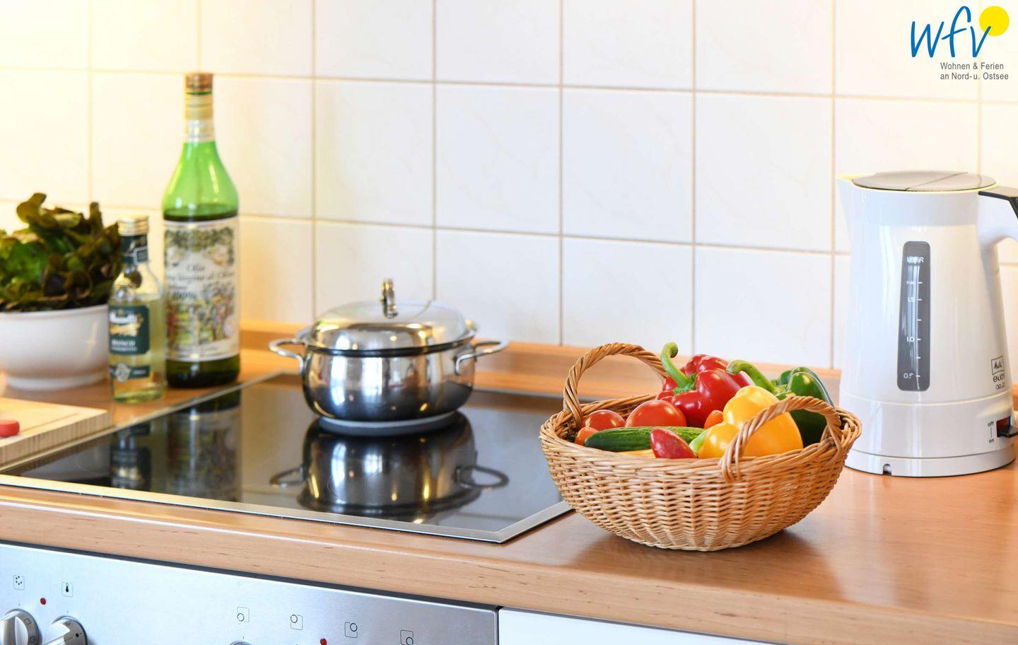 Für eine bequeme Selbstverpflegung ist die Küchenzeile der Ferienwohnung u.a. mit einem 4-Plattenherd, Backofen und Kühlschrank mit Gefrierfach, Mikrowelle und Geschirrspüler sowie Kaffeemaschine, Wasserkocher und Toaster ausgestattet.