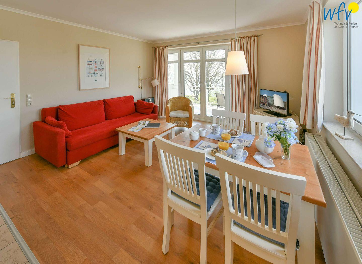Unsere Ferienwohnung auf Rügen ist ideal für romantische Tage zu zweit! Auf 43 m² Wohnfläche erwartet Sie ein großzügiger Wohnraum mit Sitzecke, Esstisch und integrierter Küchenzeile sowie ein separates Schlafzimmer und ein Duschbad.
