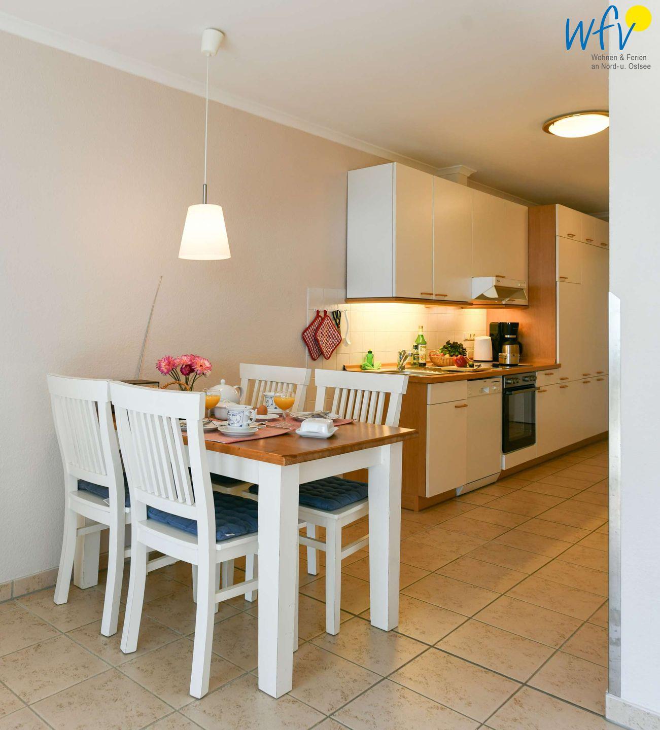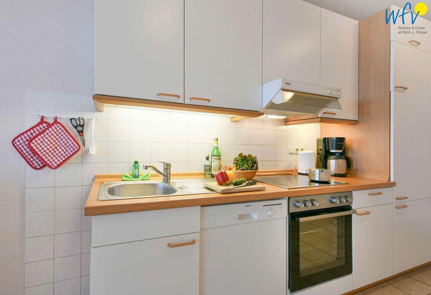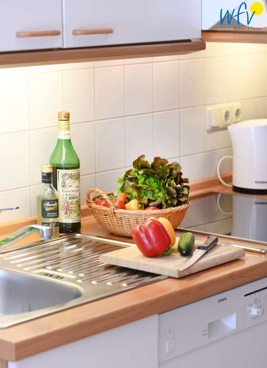 Damit Sie sich in Ihrem Urlaub auf Rügen bequem selbst verpflegen können, verfügt die Ferienwohnung über eine gut ausgestattete Küchenzeile u.a. mit Herd, Backofen, Kühlschrank mit Gefrierfach, Mikrowelle und Geschirrspüler sowie Kaffeemaschine, Wasserkocher und Toaster.