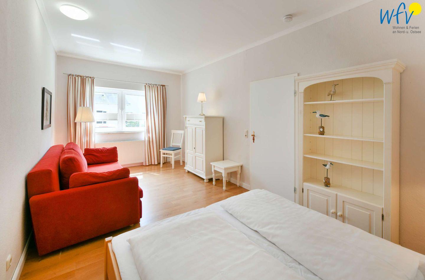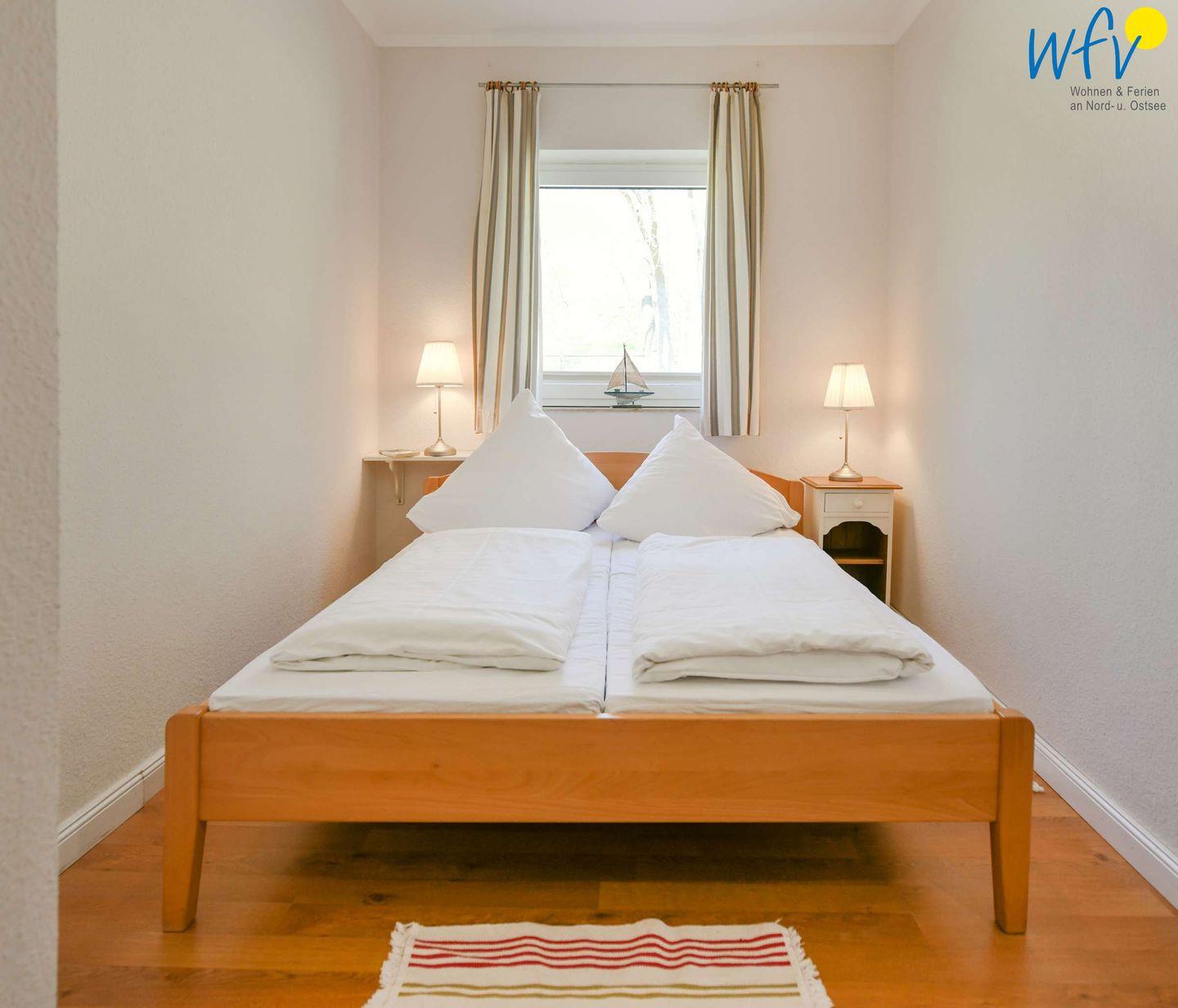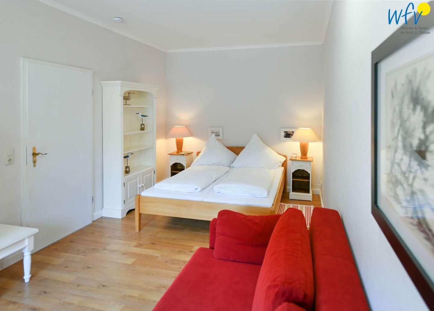 In den zwei separaten Schlafzimmern der Rügener Ferienwohnung befindet sich jeweils ein Doppelbett (1,60 m x 2 m). Eines der beiden Zimmer ist mit einer gemütlichen Leseecke mit Couch und Sessel eingerichtet. Eine Aufbettung ist möglich (auf Anfrage).
