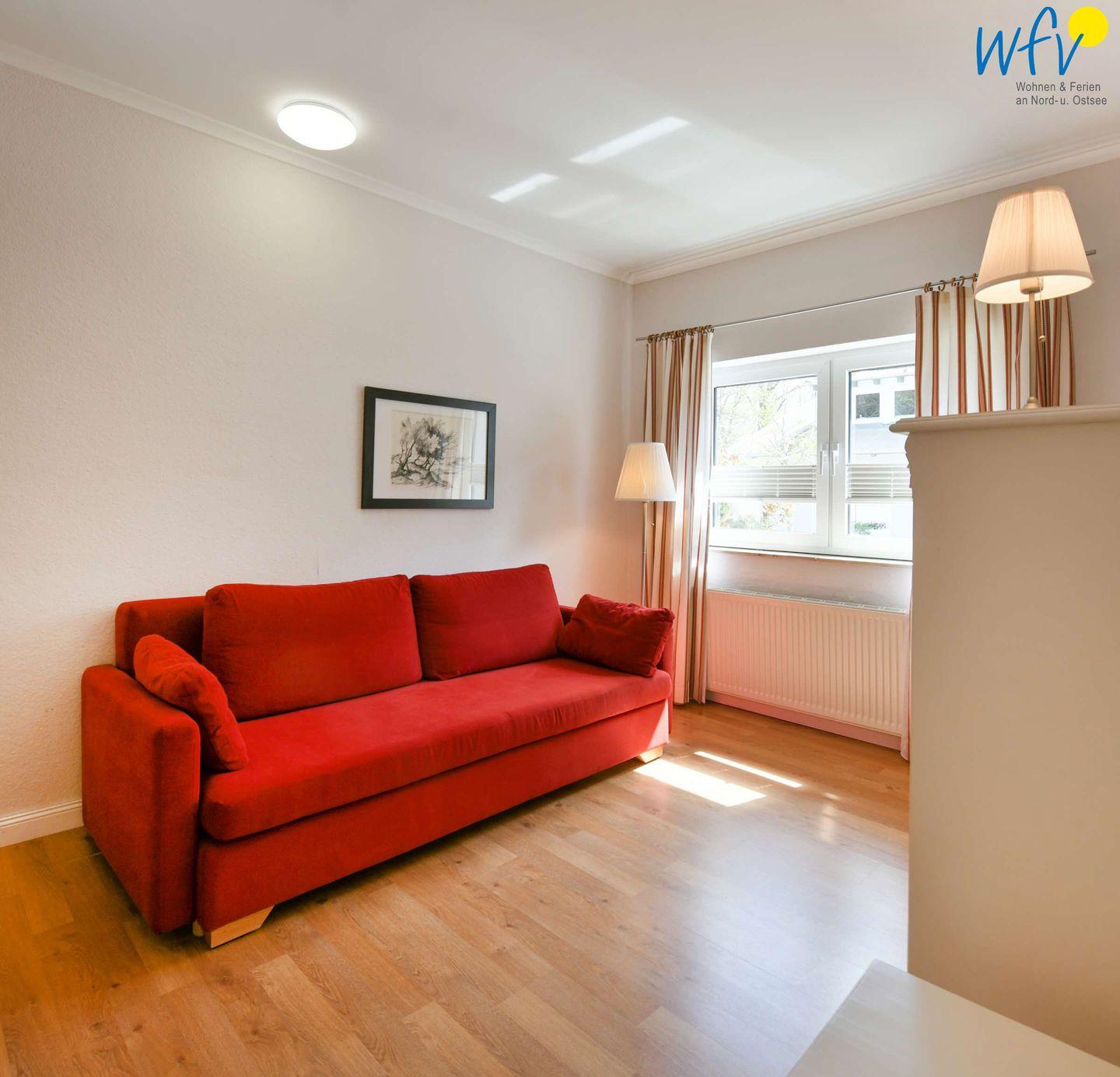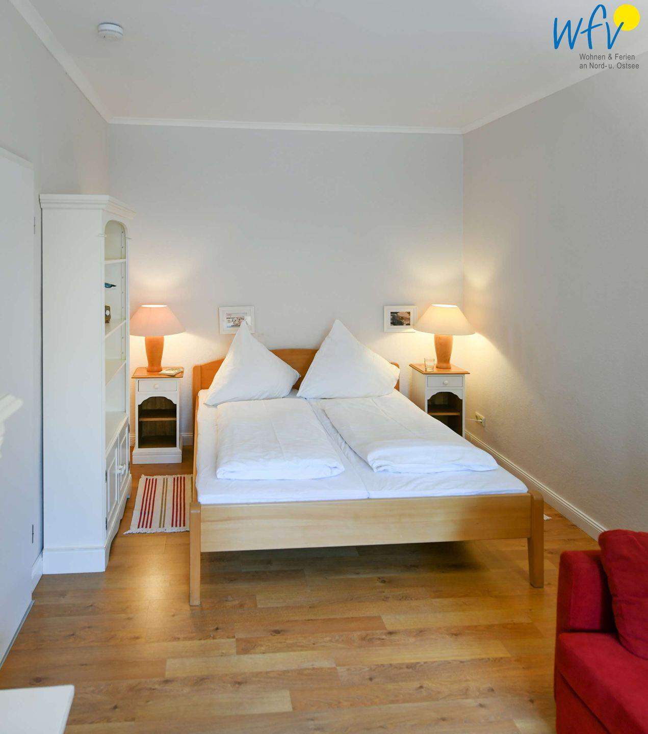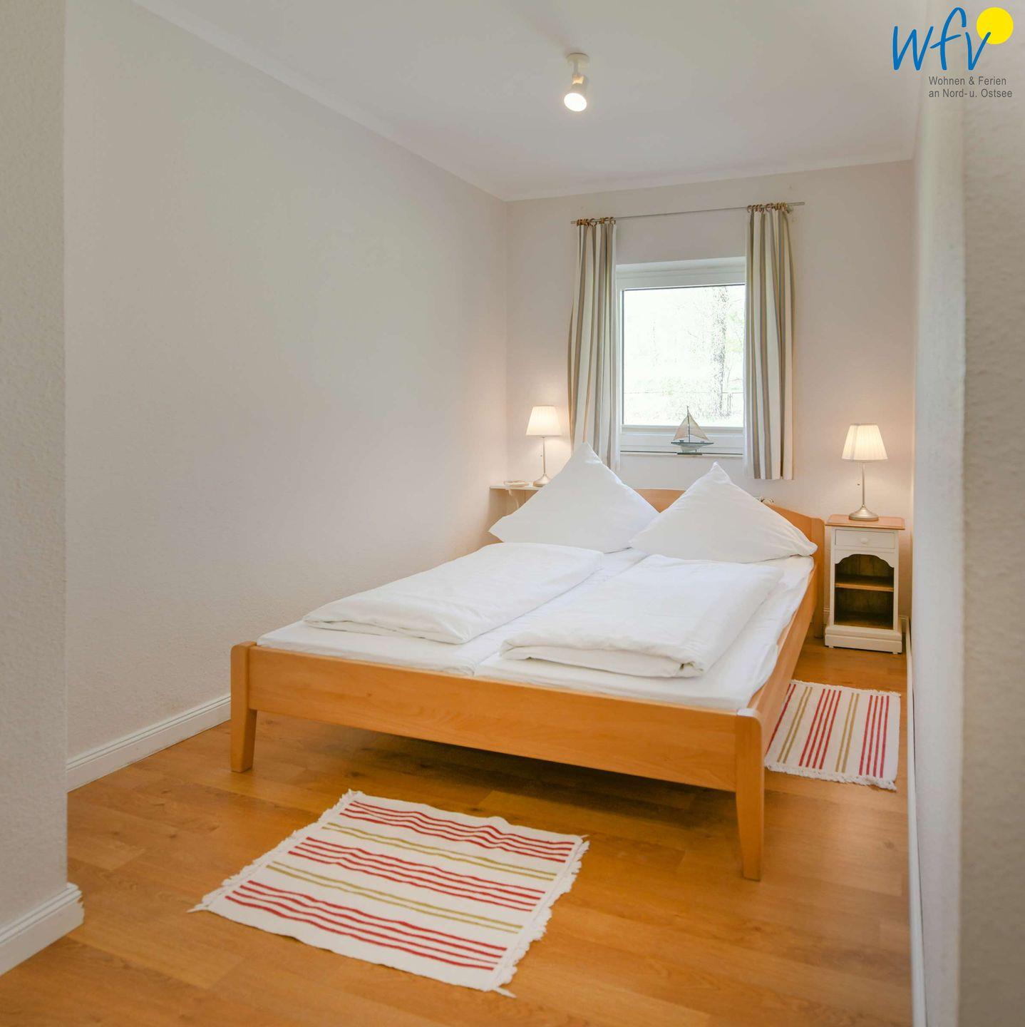 In den zwei separaten Schlafzimmern der Rügener Ferienwohnung befindet sich jeweils ein Doppelbett (1,60 m x 2 m). Eines der beiden Zimmer ist mit einer gemütlichen Leseecke mit Couch und Sessel eingerichtet. Eine Aufbettung ist möglich (auf Anfrage).