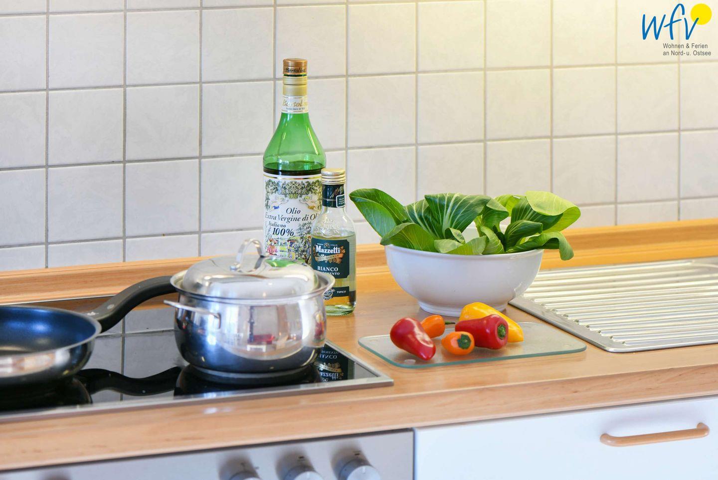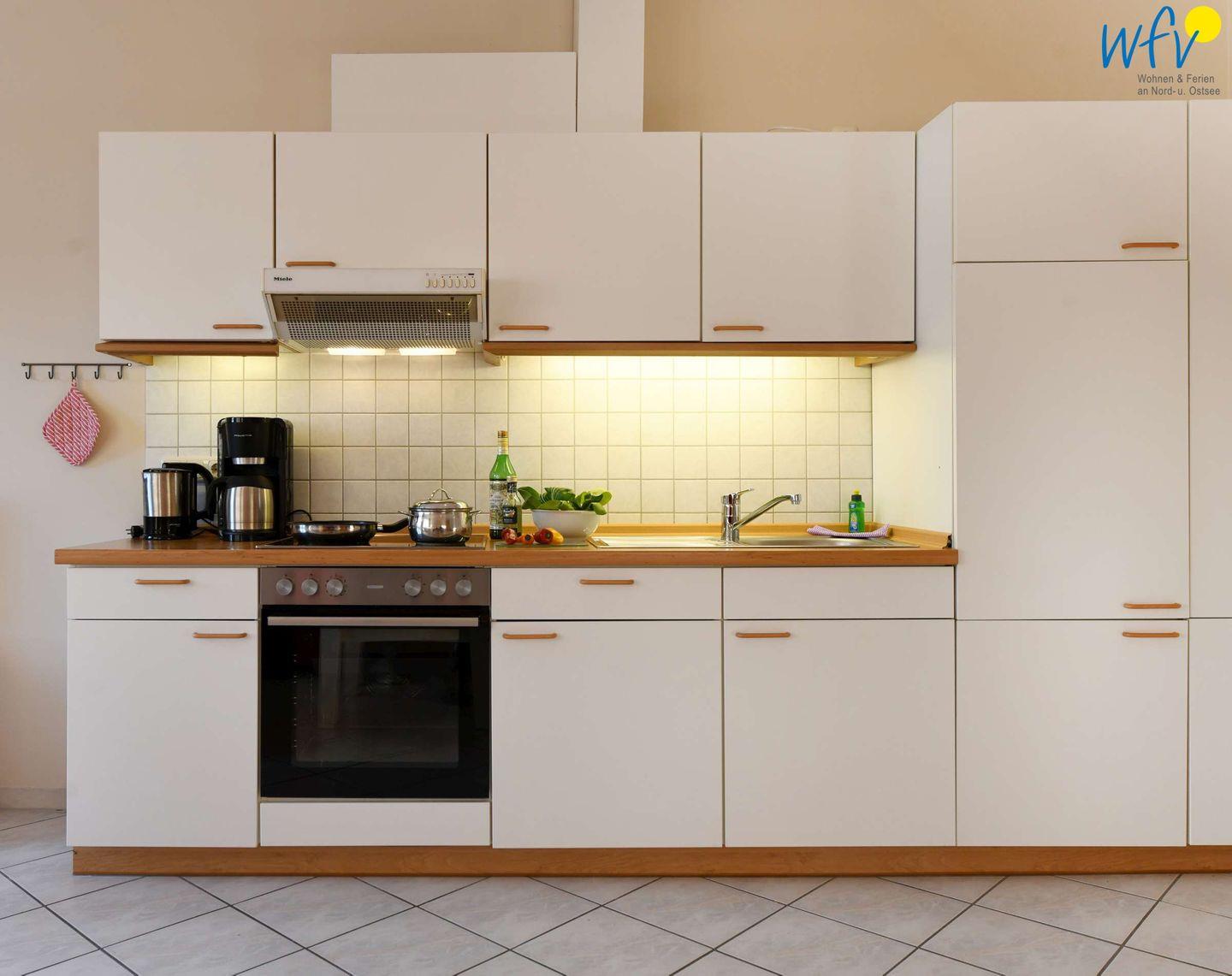 Damit Sie sich in Ihrem Urlaub auf Rügen bequem selbst verpflegen können, verfügt die Ferienwohnung über eine gut ausgestattete Küchenzeile u.a. mit Herd, Backofen, Kühlschrank mit Gefrierfach und Geschirrspüler sowie Kaffeemaschine, Wasserkocher und Toaster.