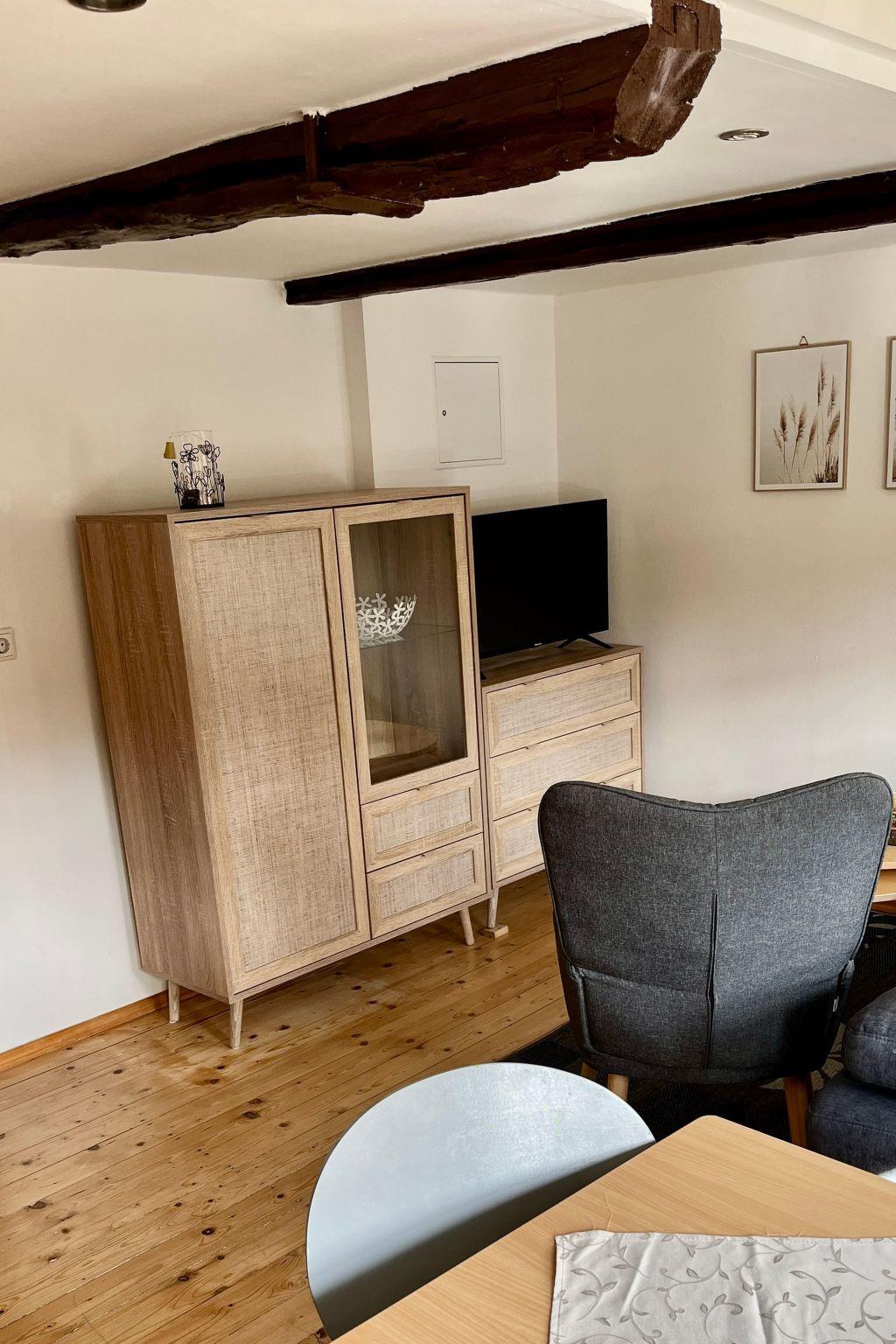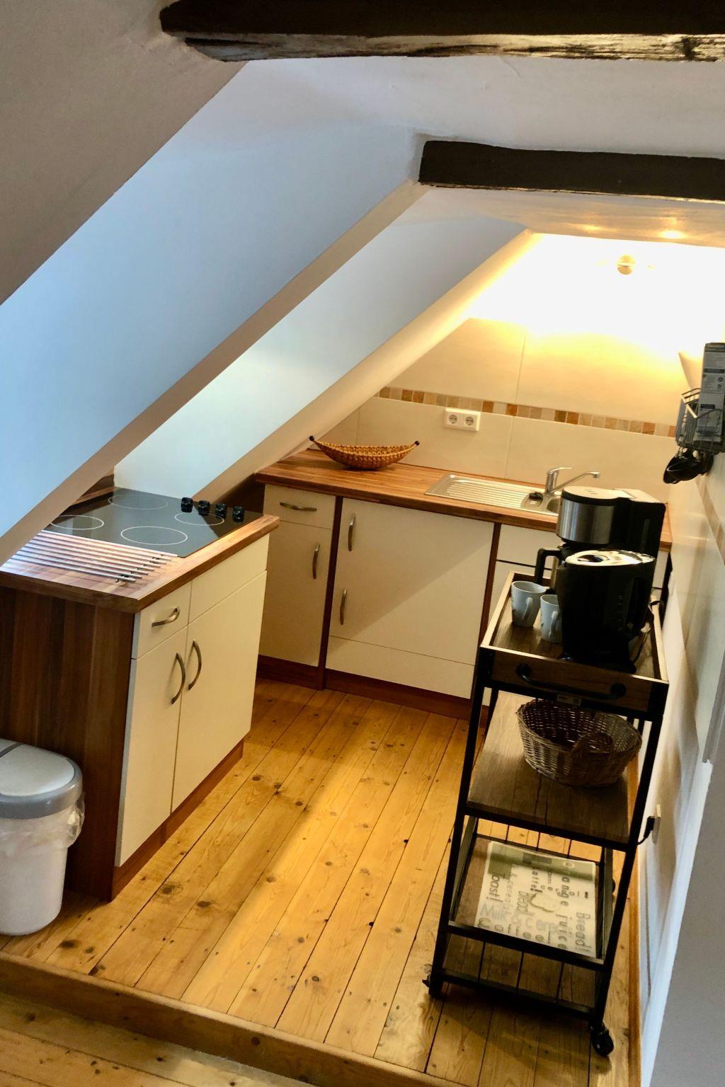 Inside the flat, you can look forward to a well-equipped kitchen that leaves nothing to be desired. From a ceramic hob and kettle to a filter coffee machine - you'll find everything you need to prepare small meals. To ensure your comfort, there is also a fan to keep you cool on hot days. Despite the modern amenities, the original character of the flat remains noticeable under the old beams and in the sleeping area under the roof, with a ceiling height of less than 1.80 metres in some places.