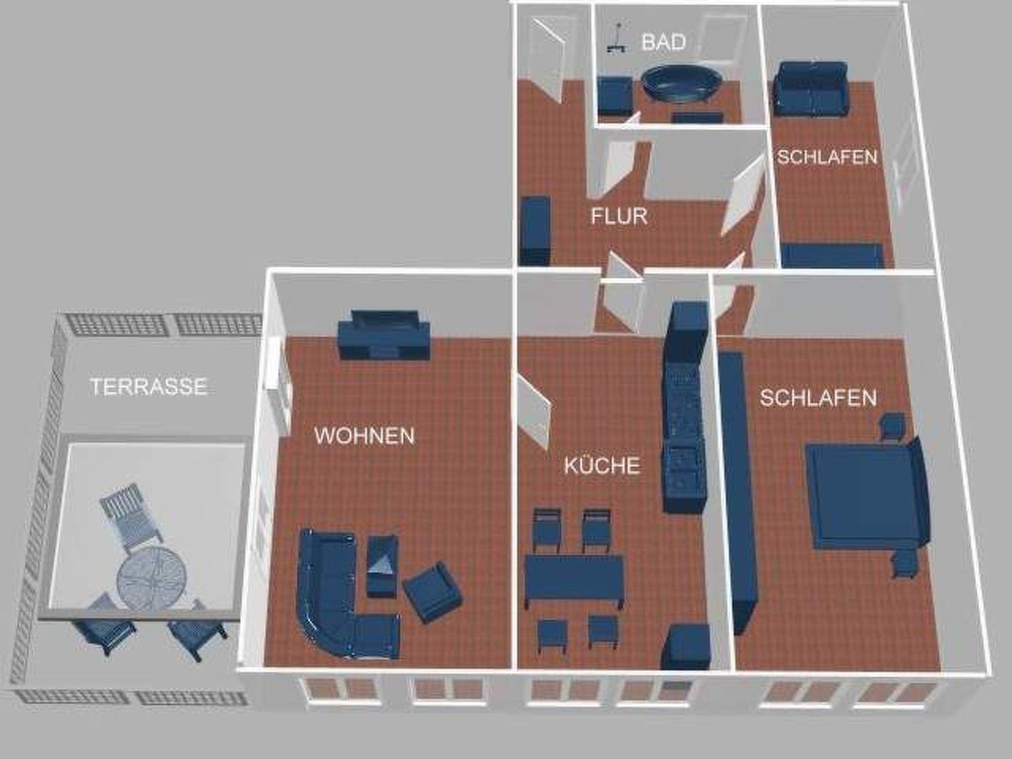 The flat is furnished to a high standard and suitable for everyday use. Two separate bedrooms each offer a large double bed measuring 180 × 200 cm as well as plenty of storage space for clothes and luggage. The beds are freshly made on arrival and bed linen is included. The living area is spacious and invites you to relax with a large corner sofa and a flat-screen TV. From here you have direct access to the partly covered terrace with garden furniture and a view of the greenery - a quiet place for breakfast in the morning sun or a glass of wine in the evening.