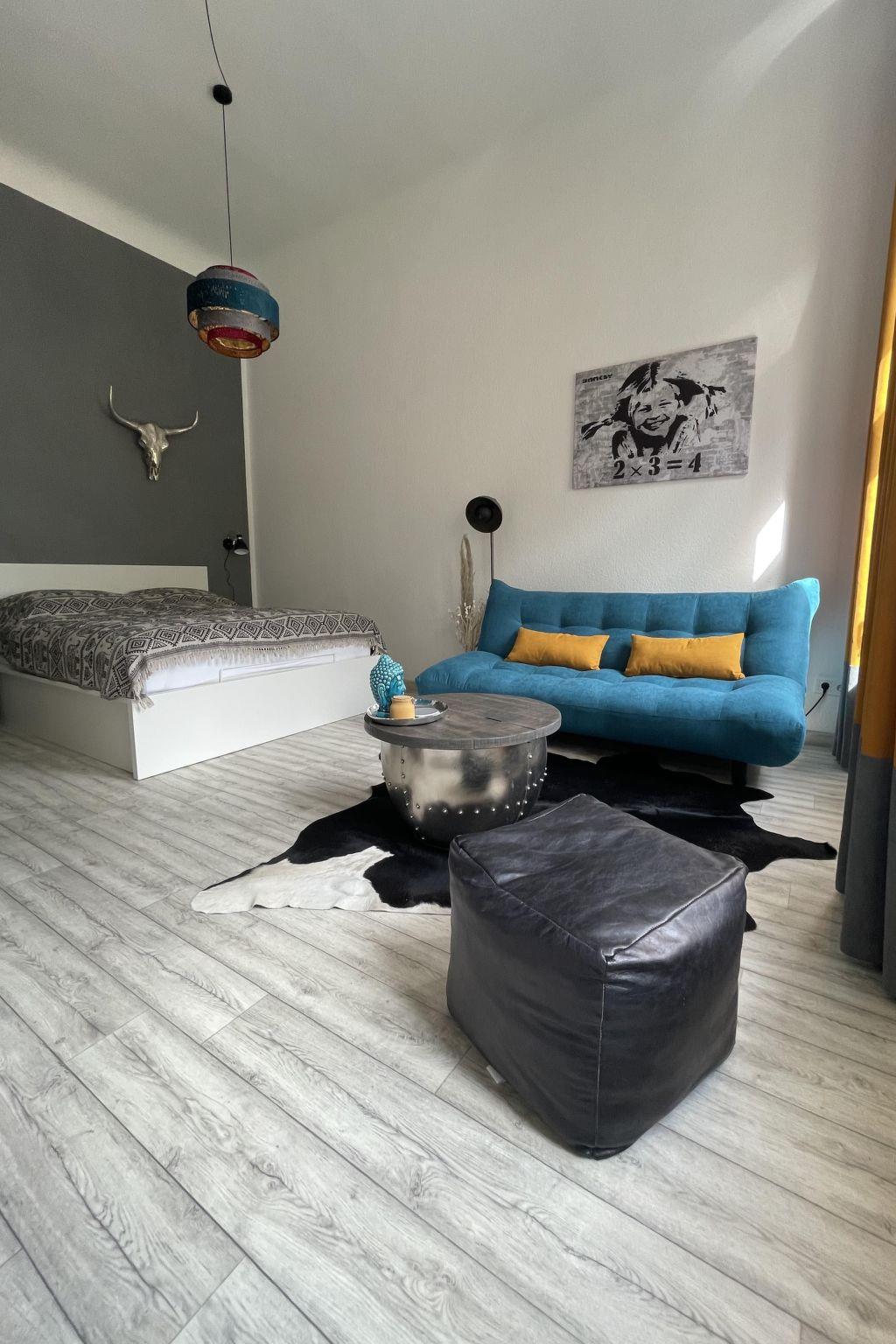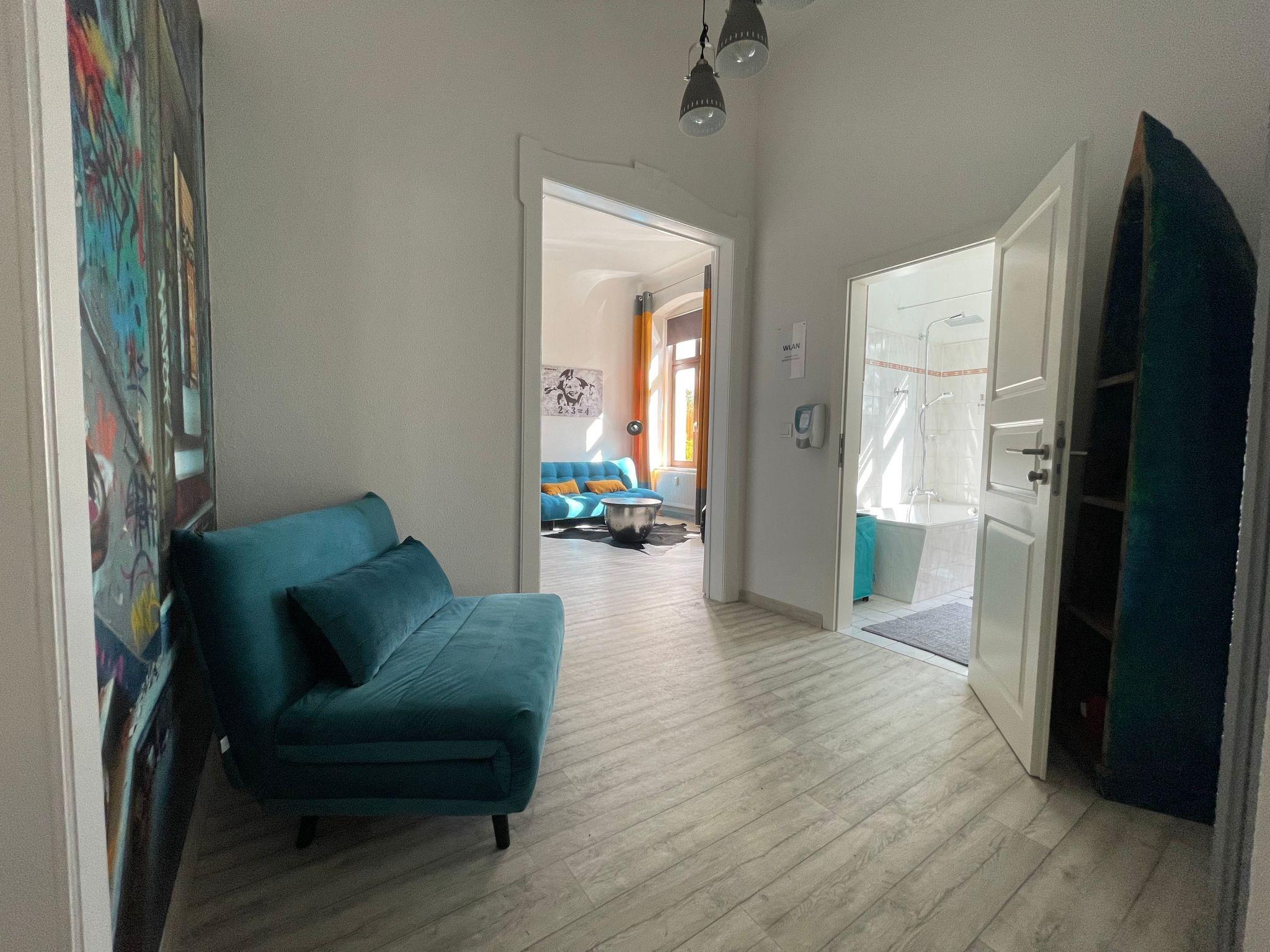 Es gibt 5 Schlafplatze für Erwachsene (Kingsize Bett für 2 Personen, ausziehbare Schlafcoach im selben Raum für 2 Personen und im Flur eine Schlafcoach ausklappbar für 1 Person und 1 Kinderbett. Ideal ist das Apartment für eine kleine Familie mit bis zu 2 Kindern. Und ja, es ist Altbau mit 3,50m Deckenhöhe. Da kommt Feeling auf. Einfach relaxen, bequem Fernsehen oder mit 100 MBIT Internetzugang Filme ONLINE streamen. Für Dauermieter ist zudem der große Kleiderschrank perfekt geeignet. Wenn du Lust hast kurz über die Grenze laufen (50m) und günstig einzukaufen oder im Afirmacije in Polen (200m) einen Cocktail schlürfen – kein Problem. Du wirst bestimmt auch den Spaziergang an der Neisse (100m), im Stadtpark in Görlitz (100m) oder Polen (200m) schätzen. Die Innenstadt mit Fußgängerzone ist übrigens in 5 Minuten zu erreichen, ebenso wie die historische Altstadt. Weclome in Görliwood!