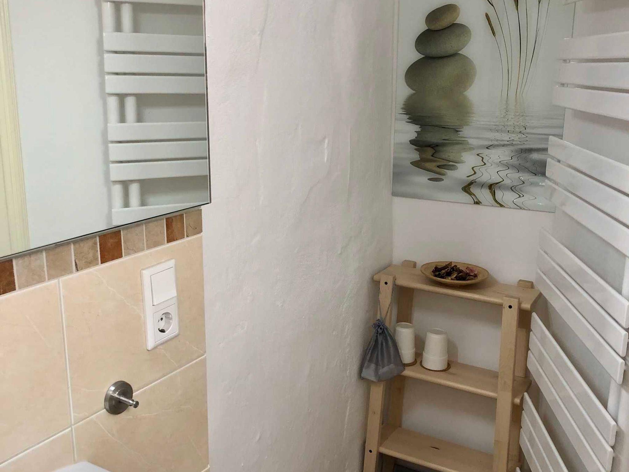 in der FeWo Peterskirche eine Dusche. Beide Wohnungen sind baugleich, in der FeWo Altstadtbrücke ist die historische Holzbalkendecke freigelegt...