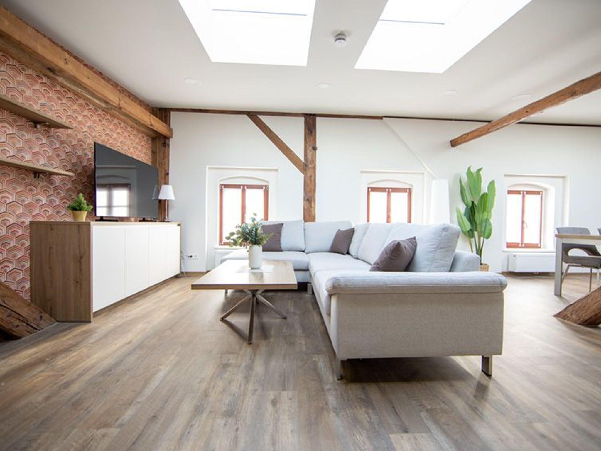 Historische Deckenbalken, edle Materialien und ein durchdachtes Farbkonzept schaffen ein Ambiente, das Ruhe ausstrahlt und Inspiration schenkt ideal für kurze oder längere Aufenthalte. Einzigartig in diesem Apartment ist die Größe und der Blick vom Demianiplatz bis zur Landeskrone. Ob Sie geschäftlich unterwegs sind oder Görlitz als Kulturstadt erleben möchten: Dieses Apartment bietet Raum zum Arbeiten, Entspannen und Genießen.