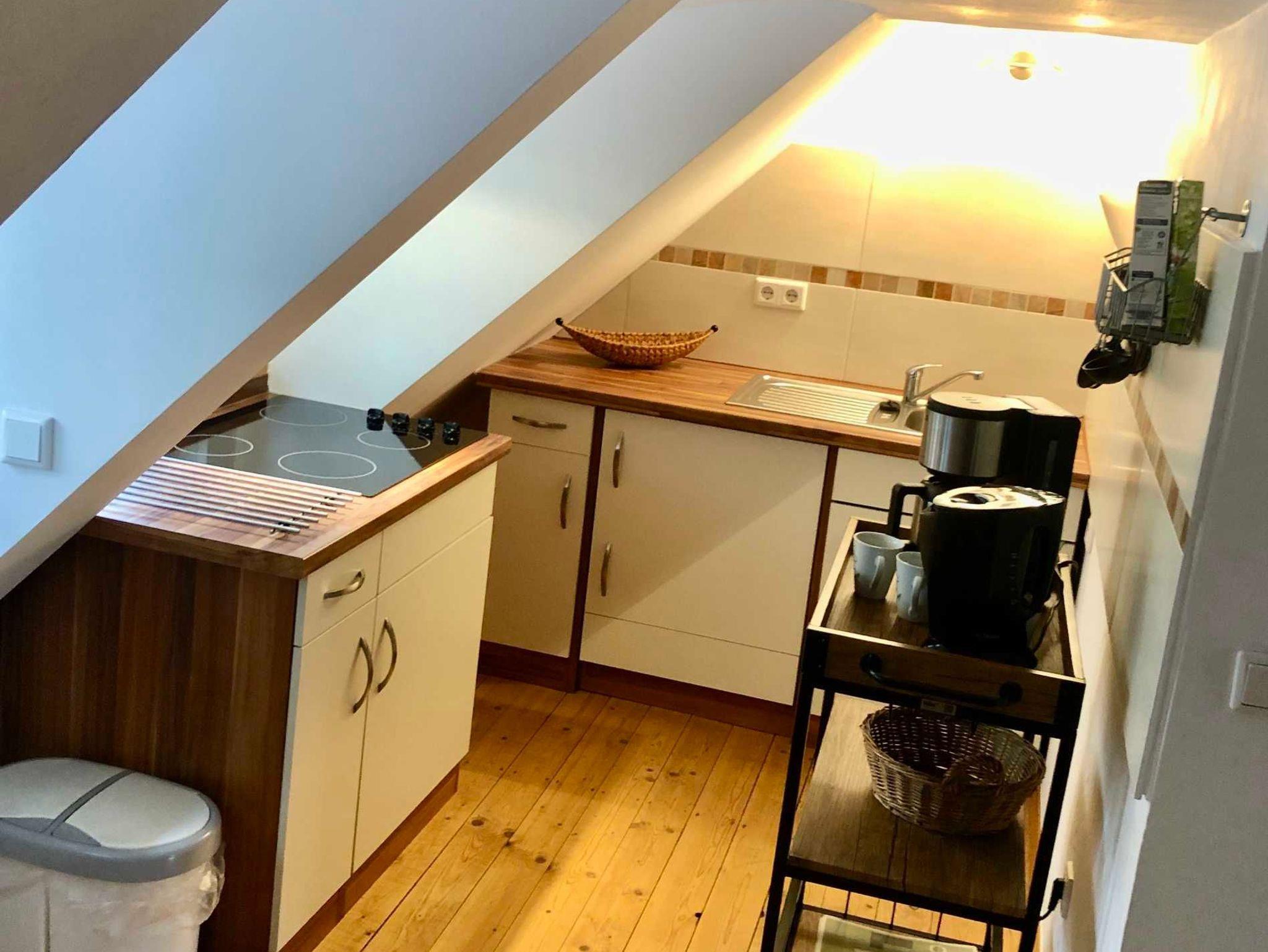 Die Landeskrone Dachgeschoss-Maisonette befindet sich unter dem Dach und verfügt über ein Schlafzimmer mit 2 Einzelbetten (90x200). Weiterhin befindet sich im Wohnbereich eine Schlafcouch. Eine Küchenzeile sowie ein Badezimmer mit Dusche ist vorhanden.