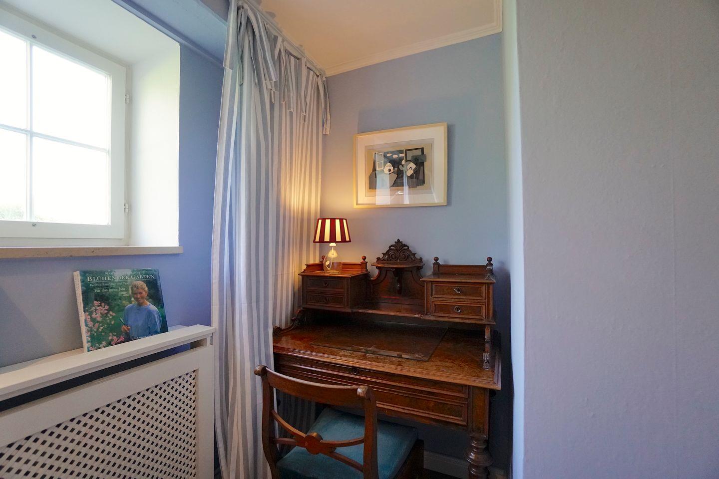 Das „Rote Zimmer“ hat ein Doppelbett (s. o.), kleinen Schreibtisch, Kleiderschrank, Kommode, Sessel und Bücherregal.