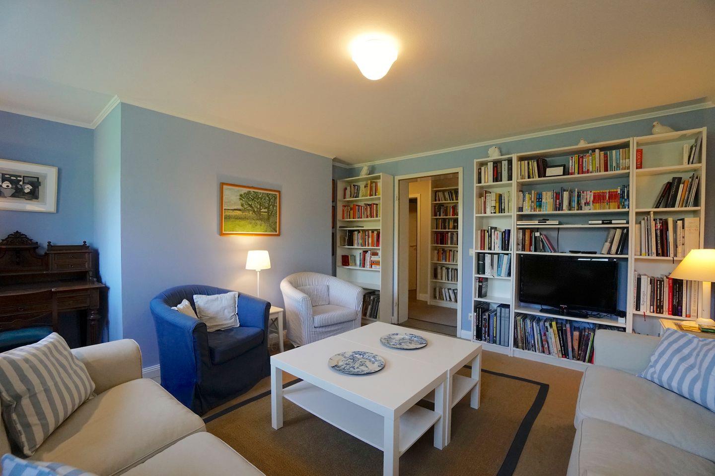 Dass Esszimmer ist für bis zu 8 Personen geeignet. Sessel und Bücher bewirken in Verbindung mit der Küche ein „Wohnküchen-Gefühl“.