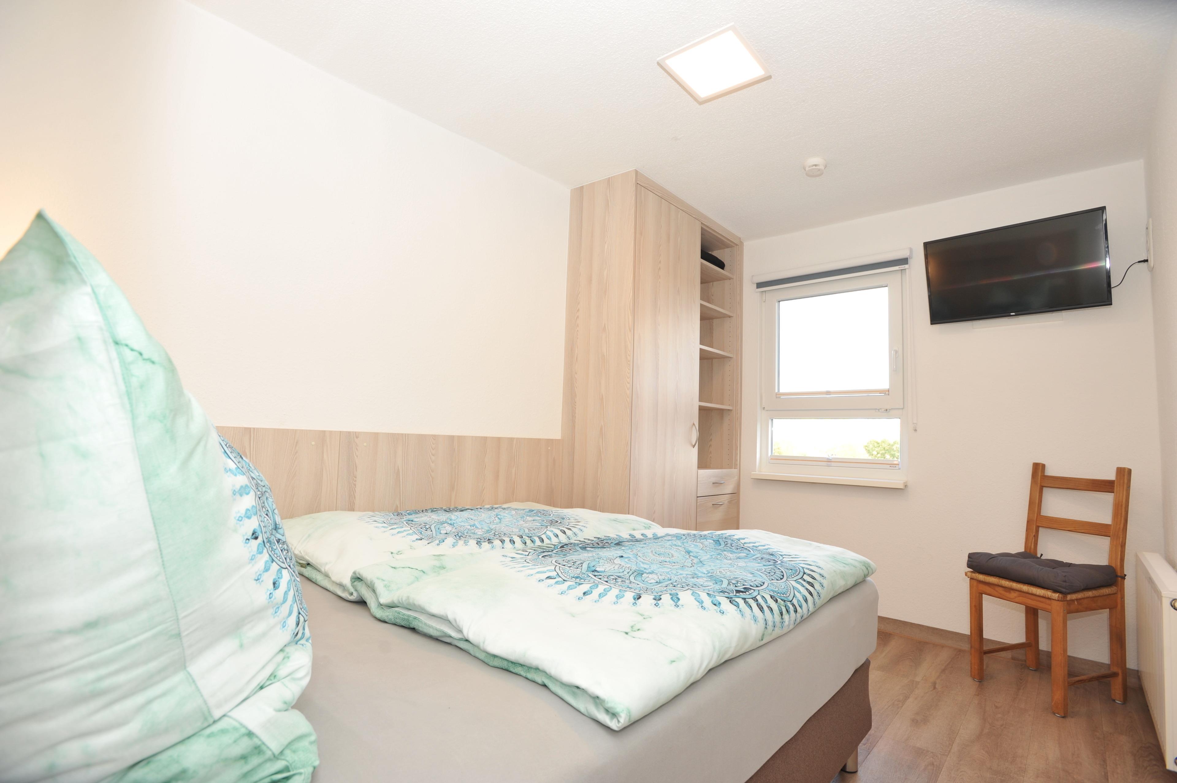 Das Hauptschlafzimmer befindet sich im Obergeschoss des Hauses. Sie erwartet ein modernes und komfortables Boxspringbett (160×210) für einen erholsamen Schlaf. Zusätzlich bietet Ihnen ein Kleiderschrank ausreichend Platz, um Ihre Sachen zu verstauen. Der 32 Zoll Smart-TV (nur Smart) kann Sie unterhalten. Schließen Sie Ihre Medien wie z. B. Amazon-Stick an.