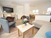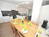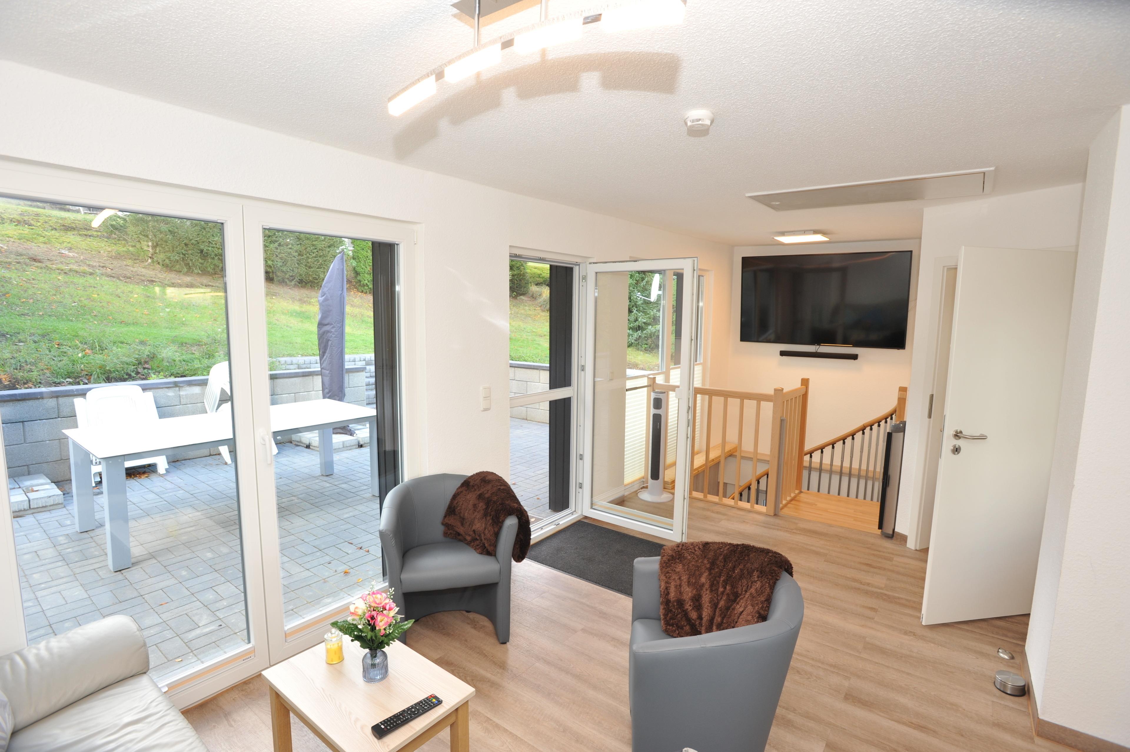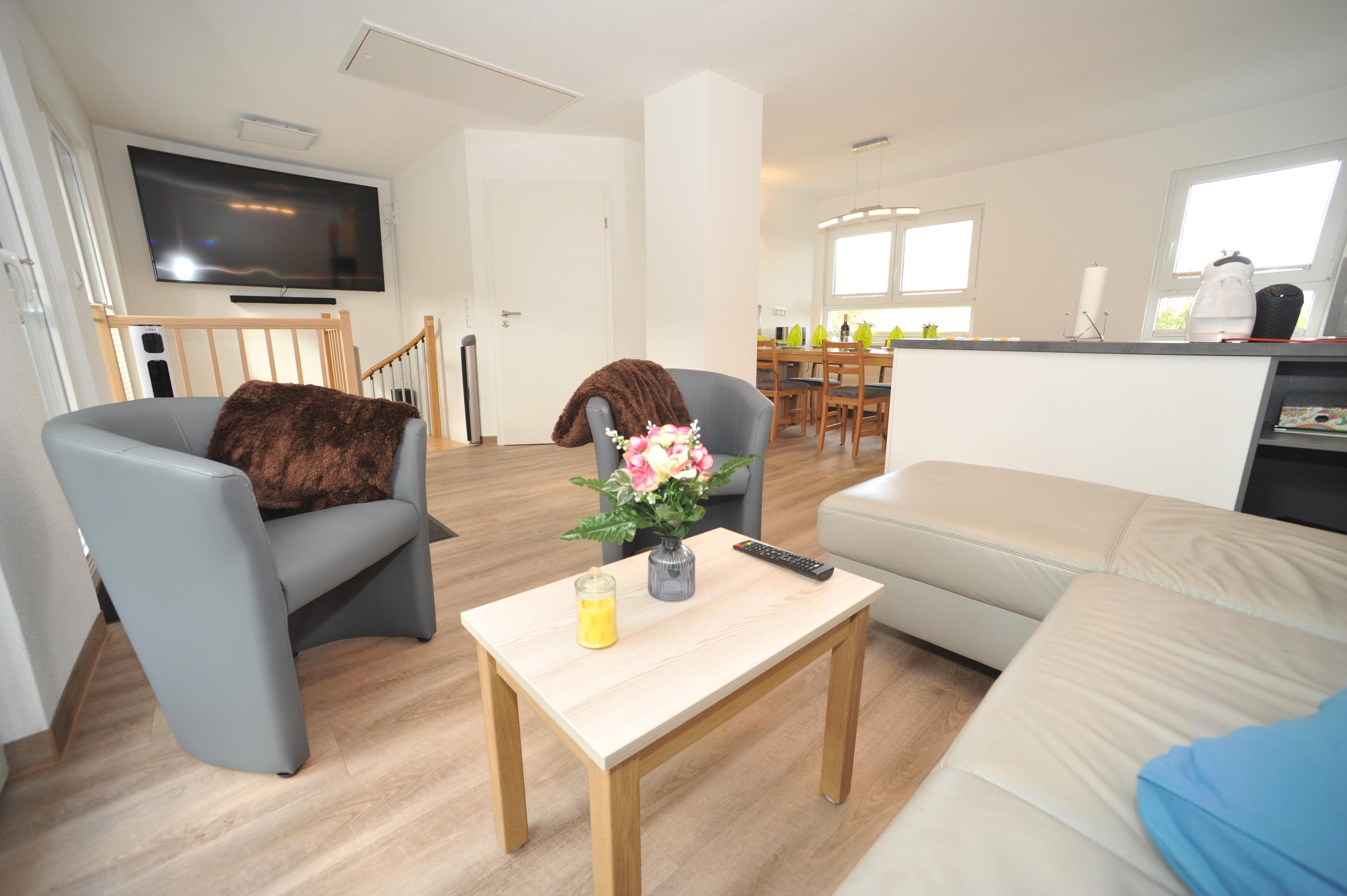 Der helle und geräumige Wohnraum mit Küchenzeile und Essecke hat eine zur Terrasse gelegene Glasfront. Vom ausziehbaren Sofa aus kann man auf dem großen 75 Zoll Smart-TV mit Sat Anschluss einen Fernsehabend genießen.
