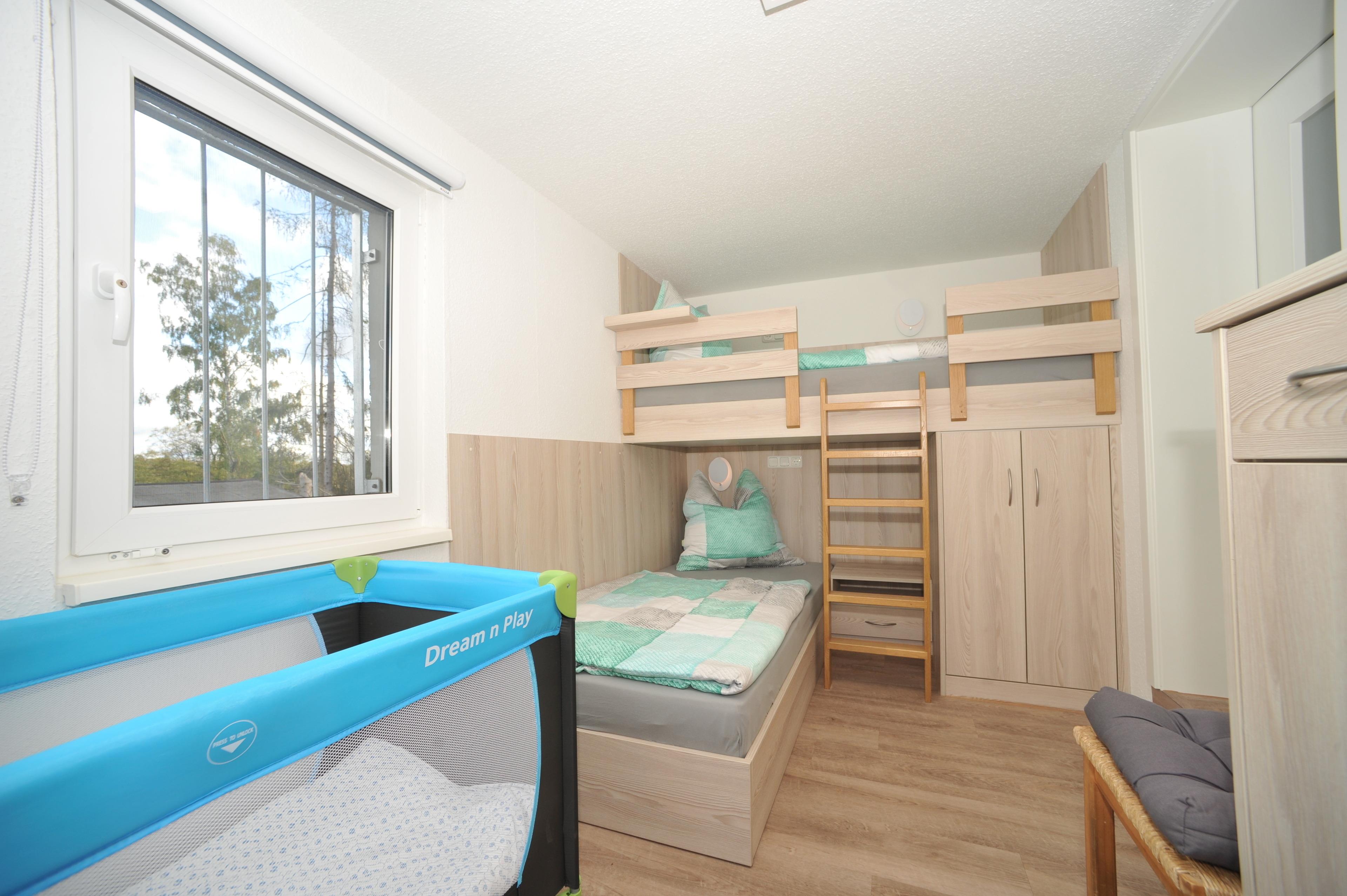 Das Kinderzimmer befindet sich im (Unter)Erdgeschoss direkt neben dem Eingang und bietet Platz für zwei Kinder oder Erwachsene. Zwei Etagenbetten (90x210) sind in den Raum angepasst. Auf dem 32 Zoll Smart-TV (nur Smart), können die kleinen ungestört gucken. Schließen Sie Ihre Medien wie z. B. Amazon-Stick an. Für die jüngsten Gäste stehen ein Babybett und ein Hochstuhl kostenlos zur Verfügung.