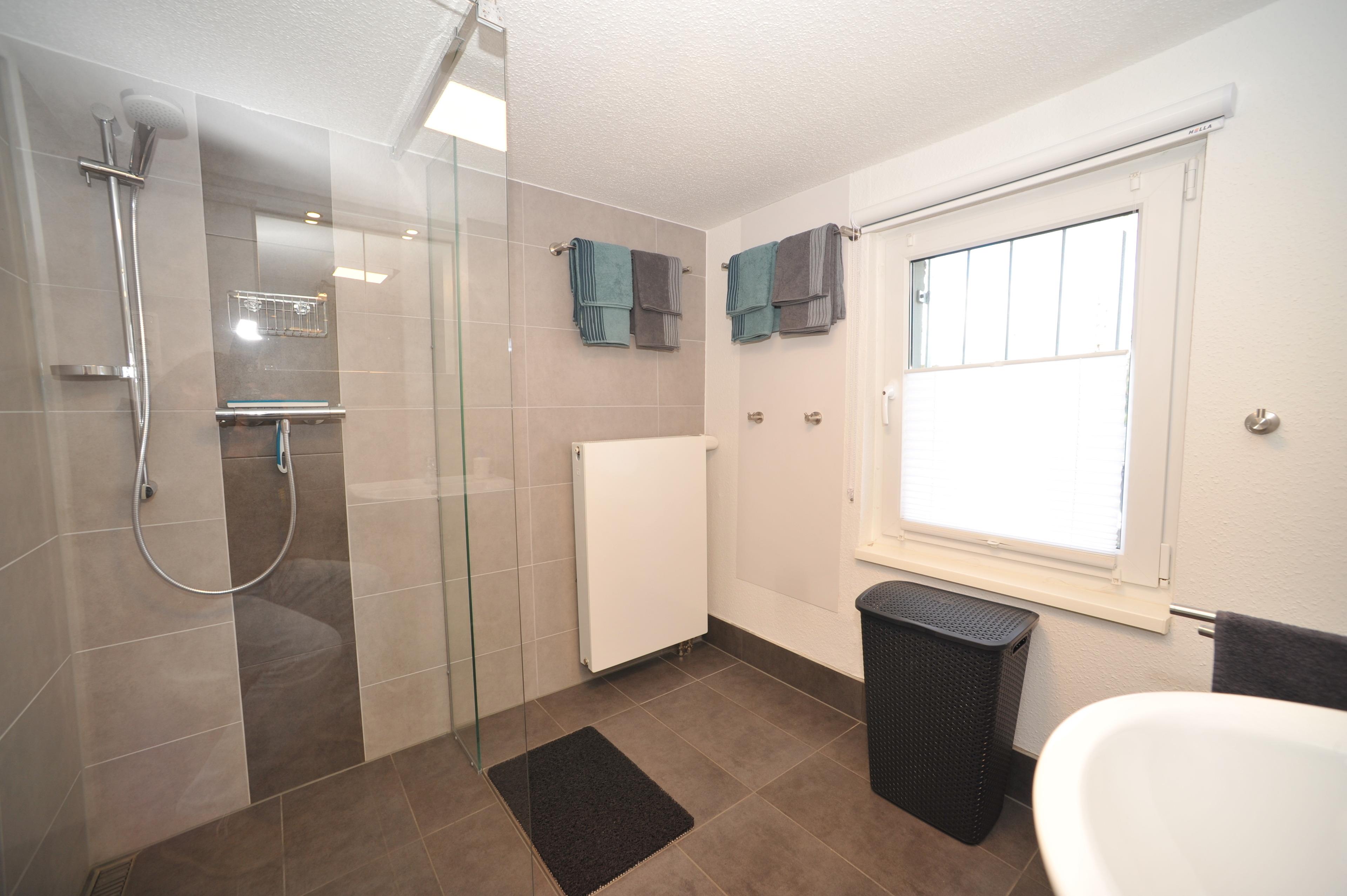 Das großzügige Badezimmer mit Dusche befindet sich im (Unter)Erdgeschoss. Ein Fön ist vorhanden. Gegenüber vom Badezimmer befindet sich ein zusätzliches WC und ein Urinal.