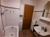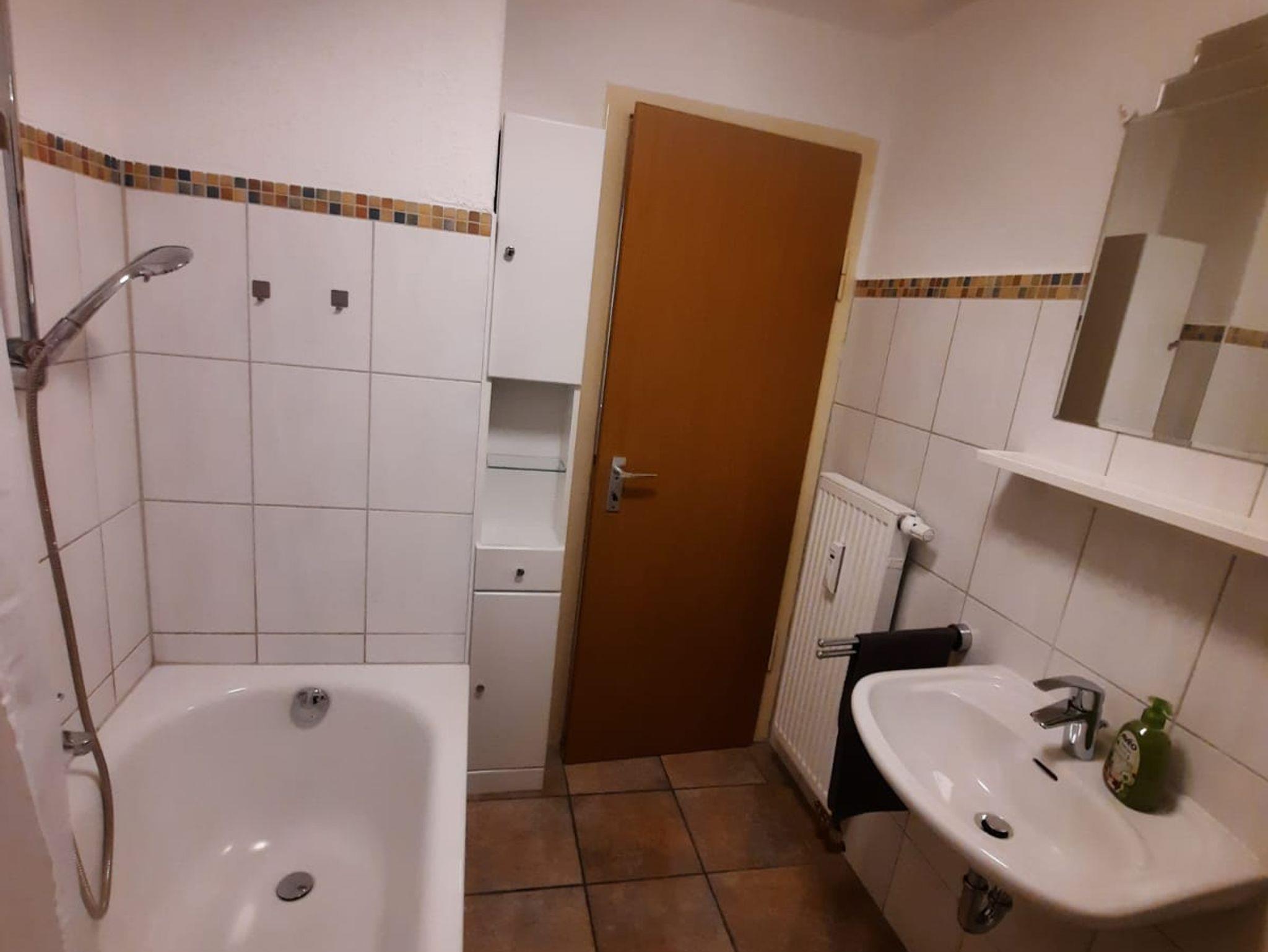 Das kleine Bad mit Waschbecken, Spiegel, Badewanne mit Duschmöglichkeit (Duschvorhang) und WC ist Funktional.
