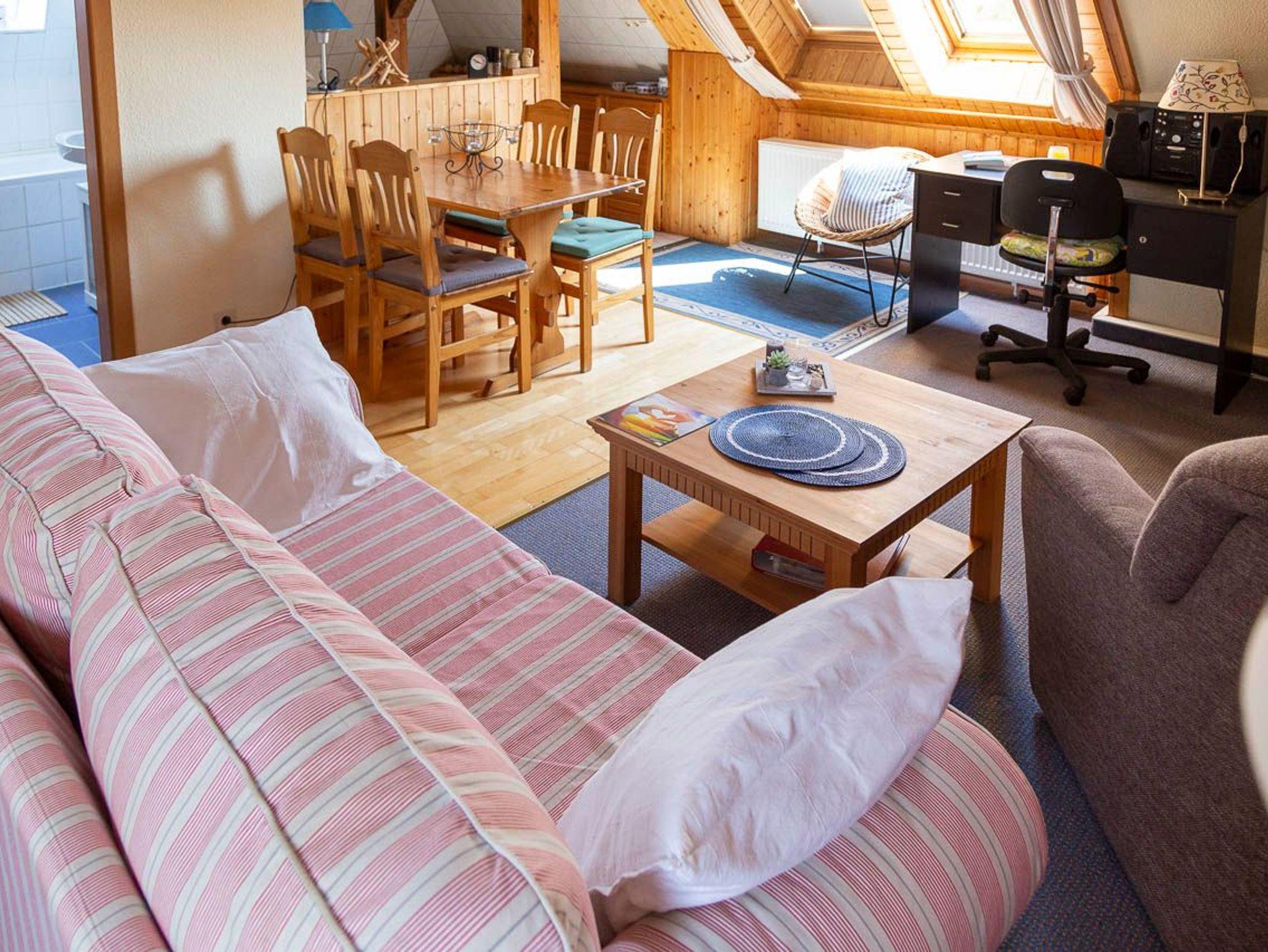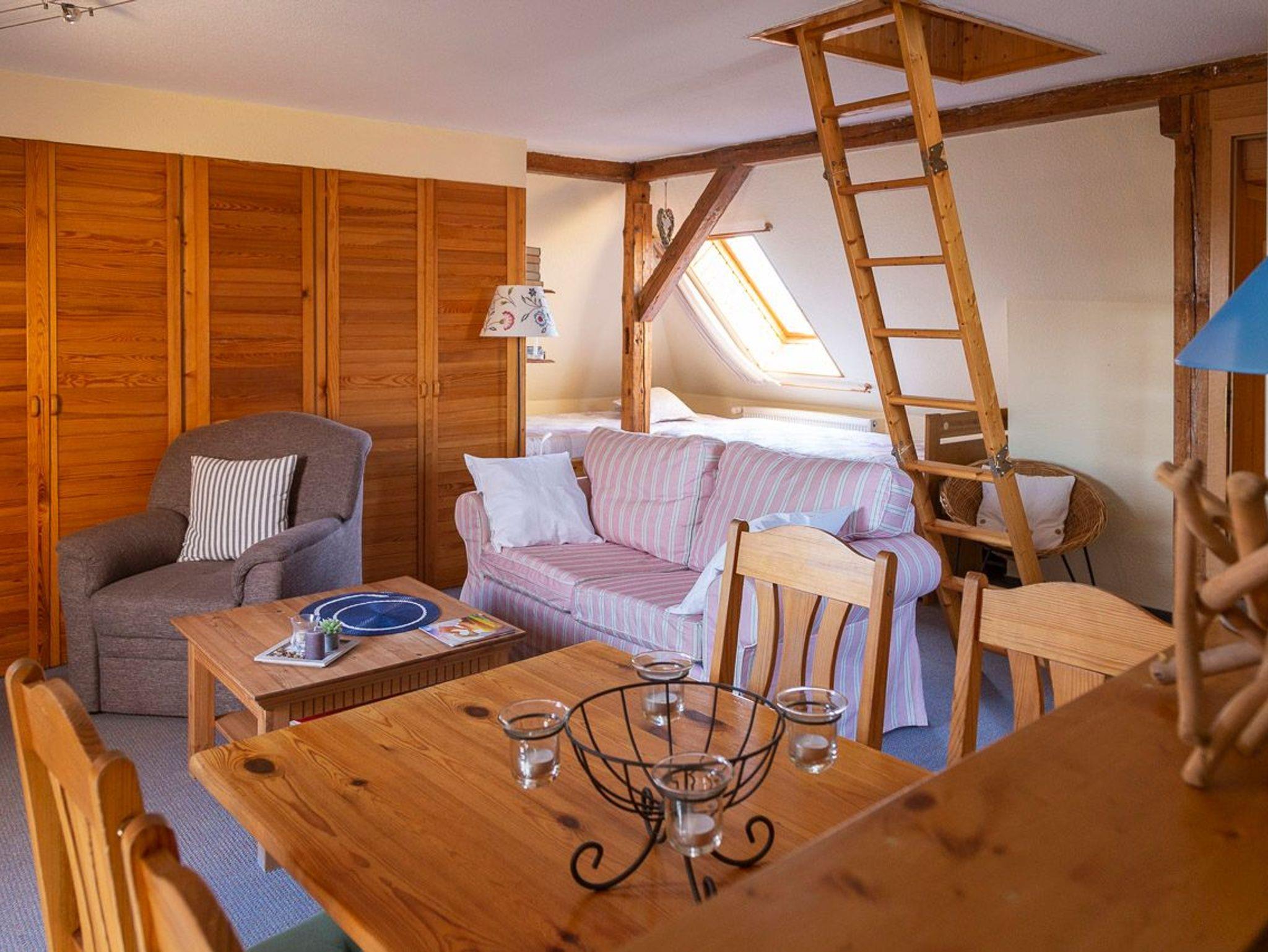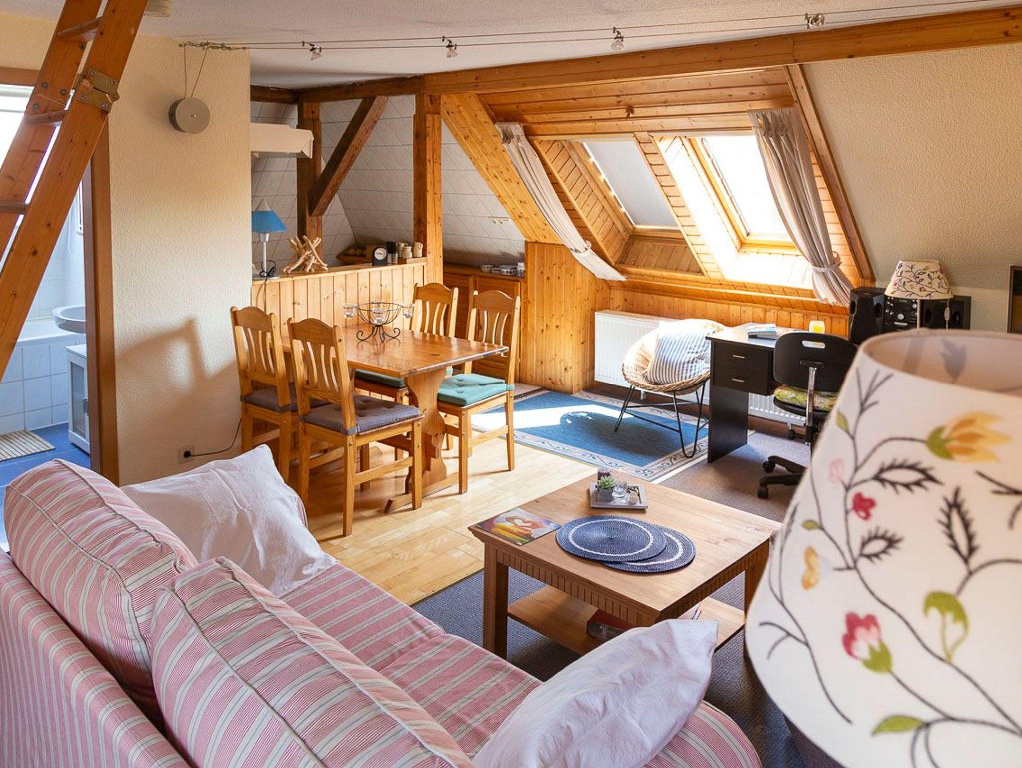 Ferienwohnung im Frühjahr 2006 frisch renoviert - neuer Teppichbelag, 2 Schlafliegen, begehbarer Kleiderschrank, Eßecke, offene Küche, Bad mit Badewanne und WC, Treppe zum offenen Hems mit Doppelbettcouch. Dachwohnung mit Dachbalken. Helle und freundliche Ausstattung mit Holz und Korbmöbeln.