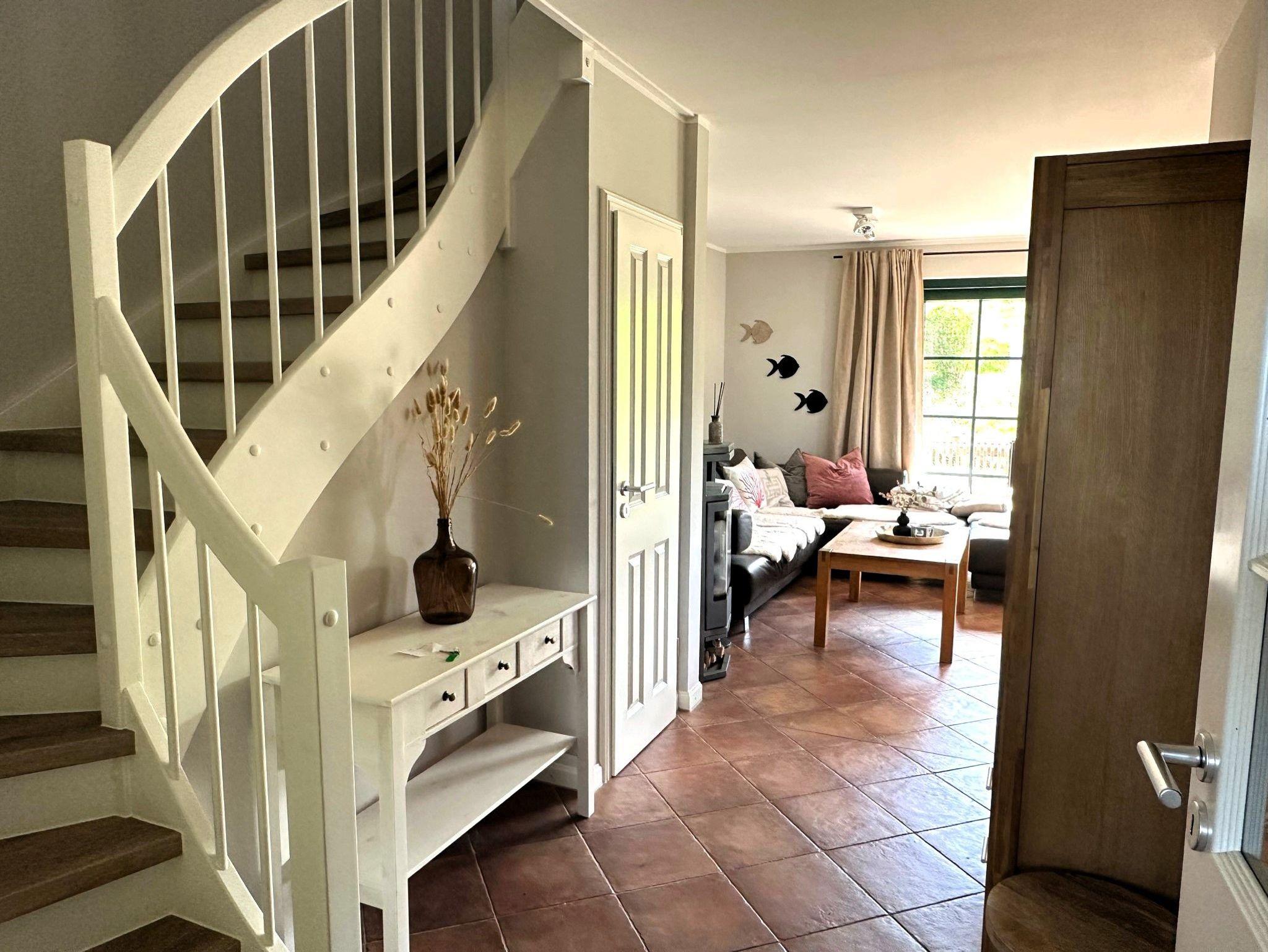 Im Obergeschoss erwarten Sie zwei Schlafzimmer mit Doppelbett sowie ein geräumiges Bad mit Badewanne, Dusche, zwei Waschbecken und einem separaten WC. Eine Waschmaschine und ein Trockner stehen zur Nutzung bereit. Im oberen Bad befindet sich auch die geräumige Sauna, die jeden Aufenthalt zum Wellnessurlaub macht.