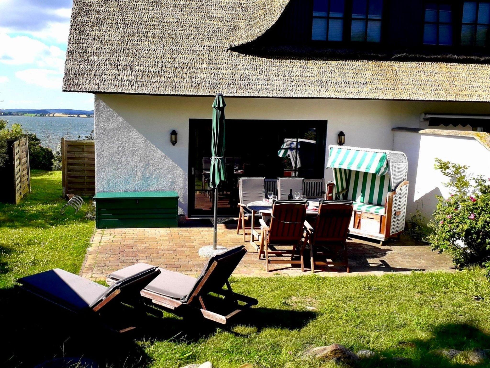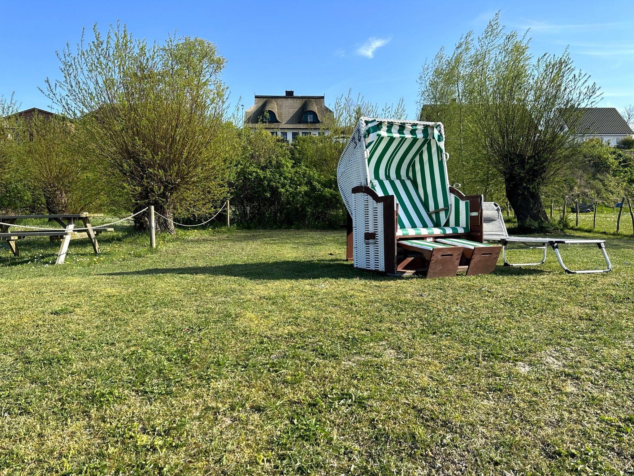 Der private Wasserzugang zum Bodden ist etwa 100 m vom Haus entfernt und über eine Treppe erreichbar. Hier können Sie sich in Ihrem eigenen Strandkorb erholen. Das großzügige Grundstück bietet großen und kleinen Gästen die Möglichkeit, viele Aktivitäten direkt vom Haus aus zu unternehmen. Der Bodden ist eine ruhige Bucht der Ostsee und somit ideal zum gefahrlosen Planschen als auch zum Ausüben diverser Wassersportarten. Am Wasser stehen Ihnen zusätzlich ein Strandkorb und zwei Sonnenliegen zur Verfügung, je nach Wetterlage etwa von Mai bis Anfang Oktober. Eine Treppe führt direkt zum Wasser. Das Grundstück ist NICHT eingezäunt!