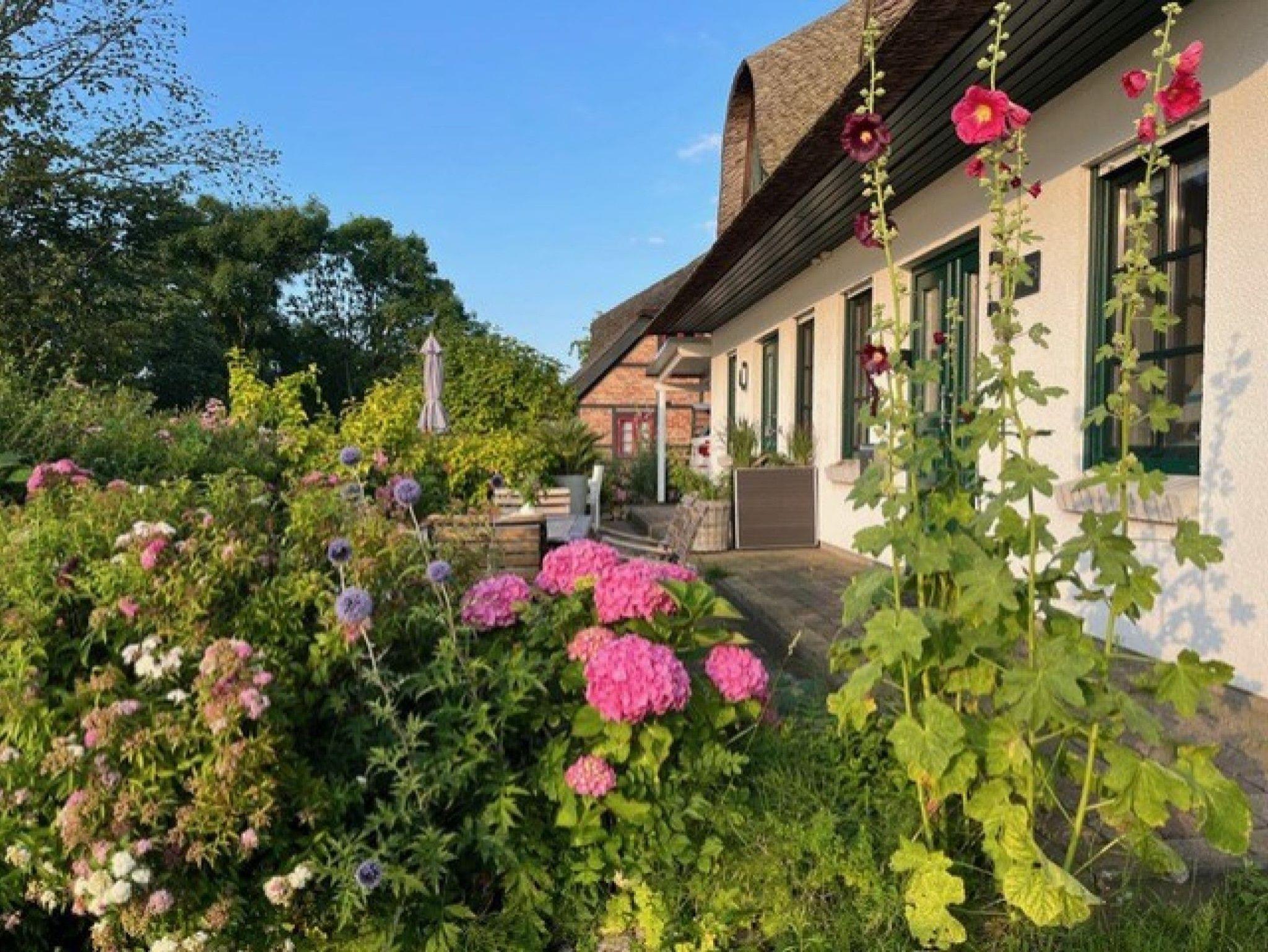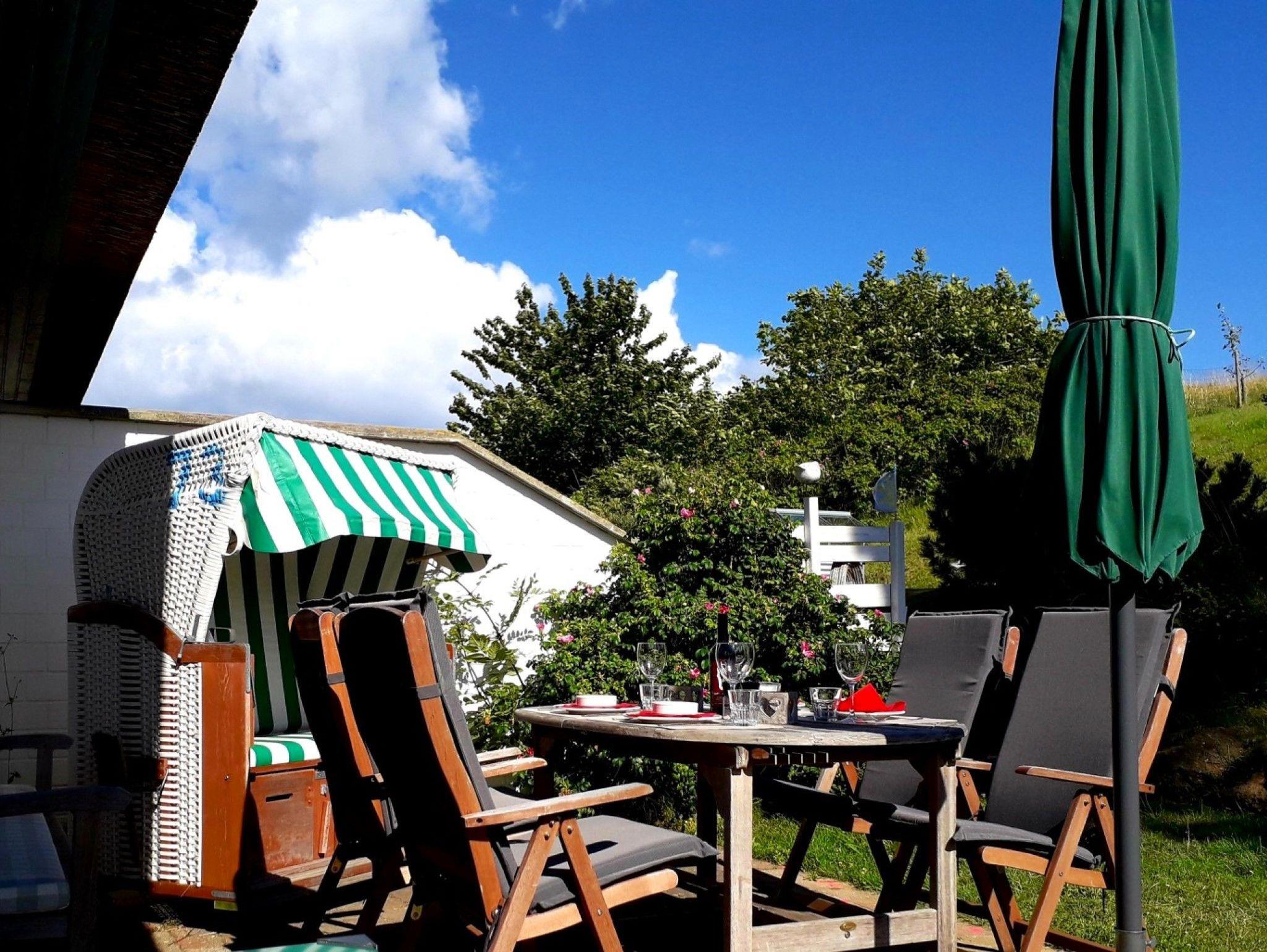 Der Außenbereich wurde mit viel Liebe gestaltet und ist von einem Friesenwall mit Heckenrosen umgeben. Entspannen Sie im Garten oder auf den beiden Terrassen, welche mit Gartenmöbeln und einem eigenen Strandkorb ausgestattet sind. Auf dem Grundstück befindet sich ein Parkplatz für zwei Fahrzeuge, und es gibt auch eine Abstellmöglichkeit für Ihre Fahrräder.