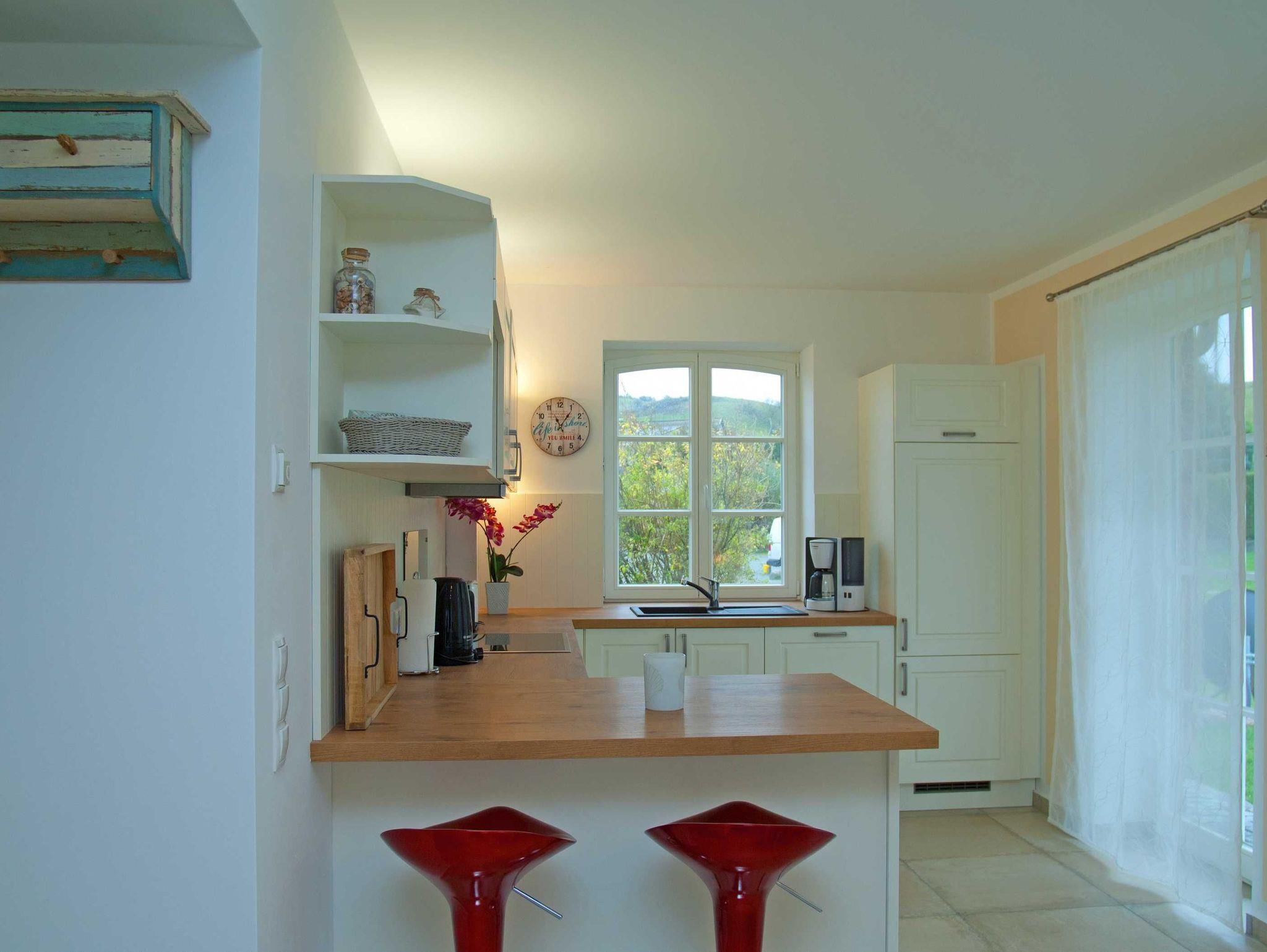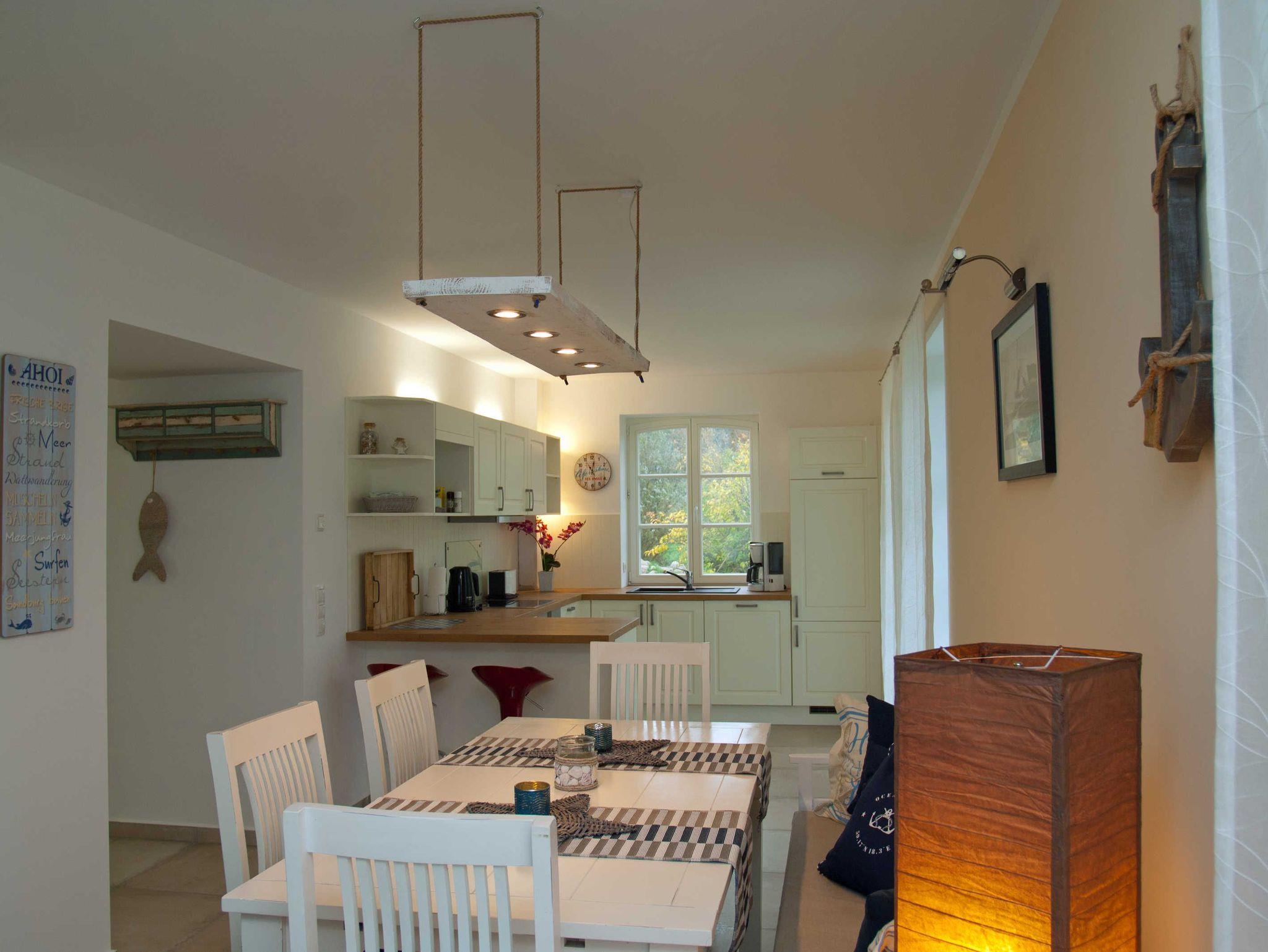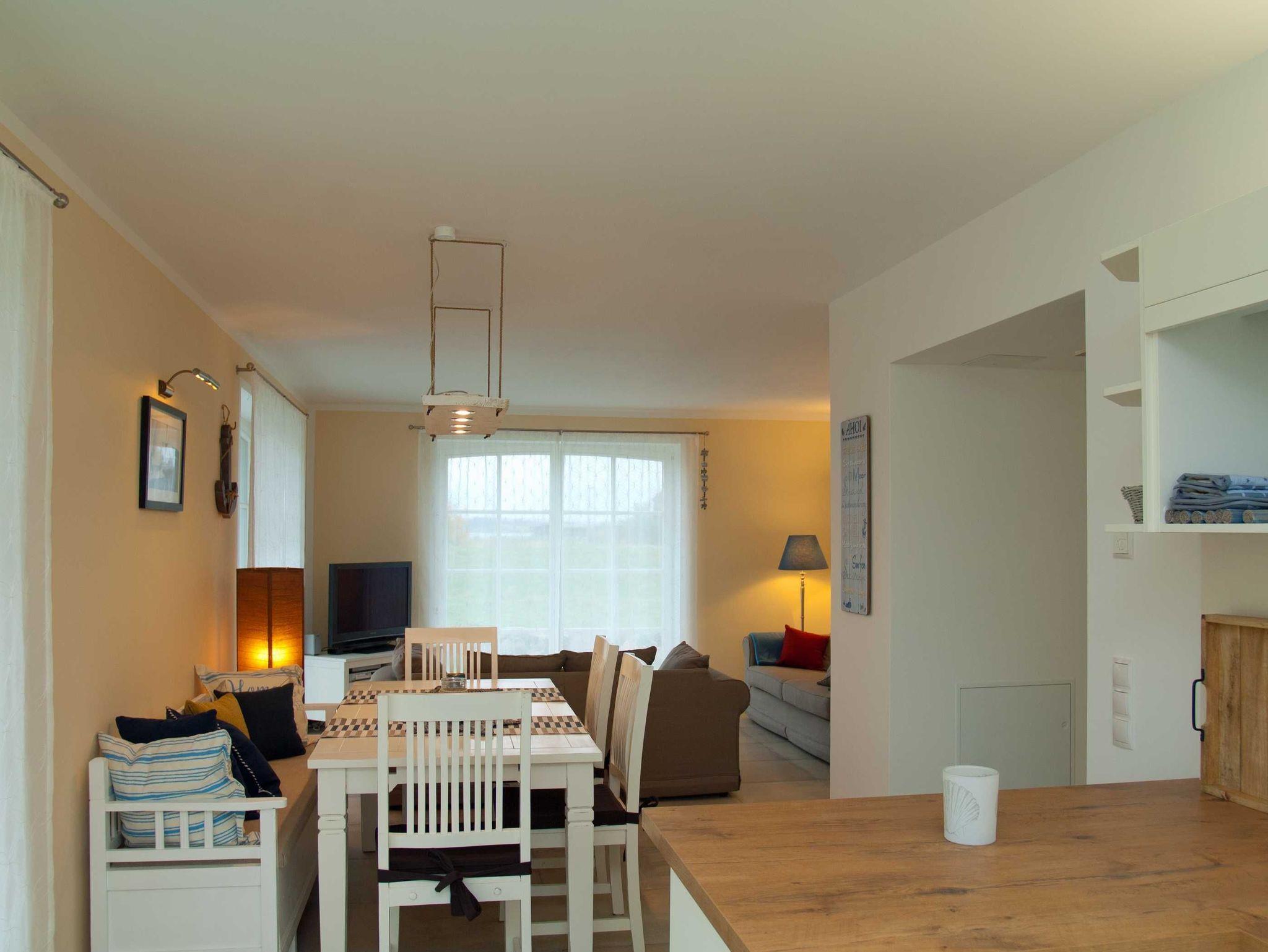 Die liebevoll eingerichtete Ferienwohnung Boddenblick (EG) verfügt über einen großzügigen Wohnbereich mit offener Küche und Esstisch für gemütliche Abende für bis zu vier Personen.
