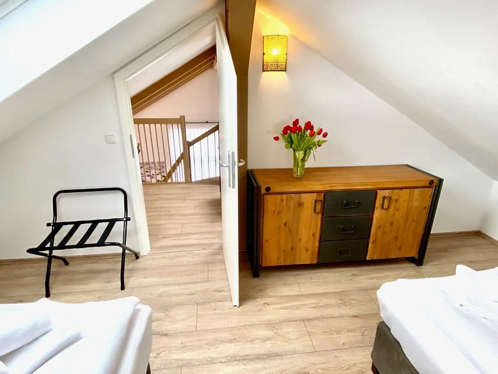 • 2 Schlafzimmer mit je einem 1,80 m breiten Doppelbett und 1 Schlafzimmer mit 2 je 90 cm breiten Einzelbetten