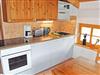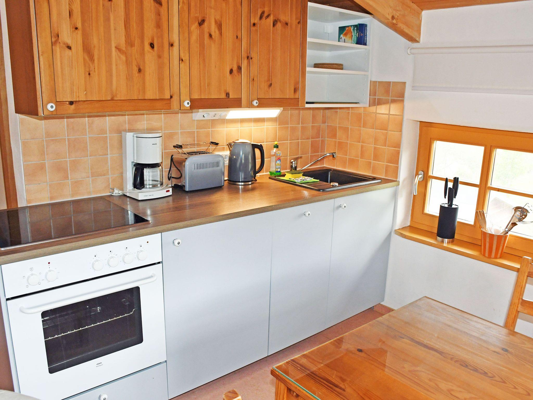 Die moderne Küchenzeile ist mit einem Herd, Wasserkocher, Kaffeemaschine, Toaster und Kühlschrank ausgestattet.