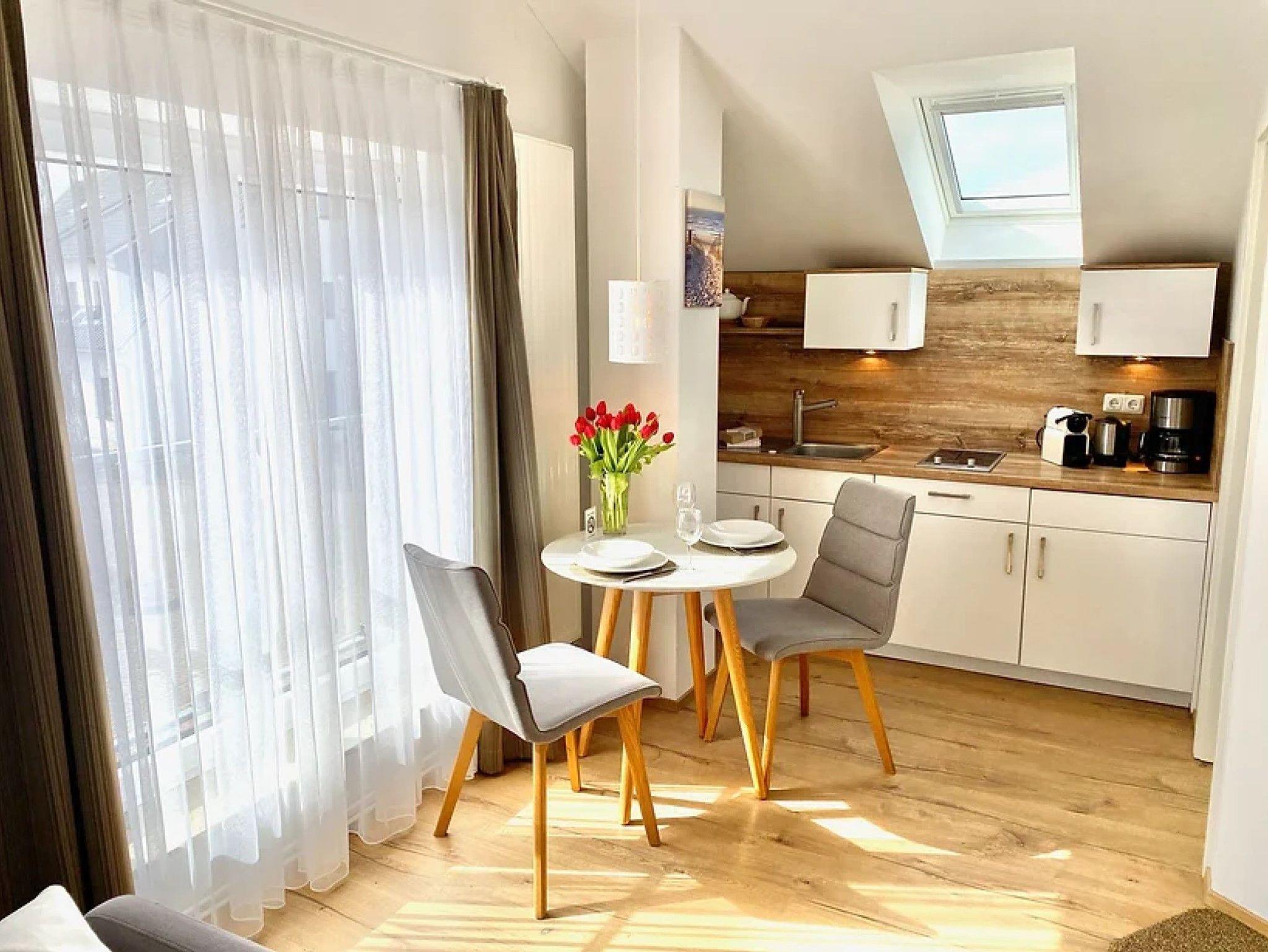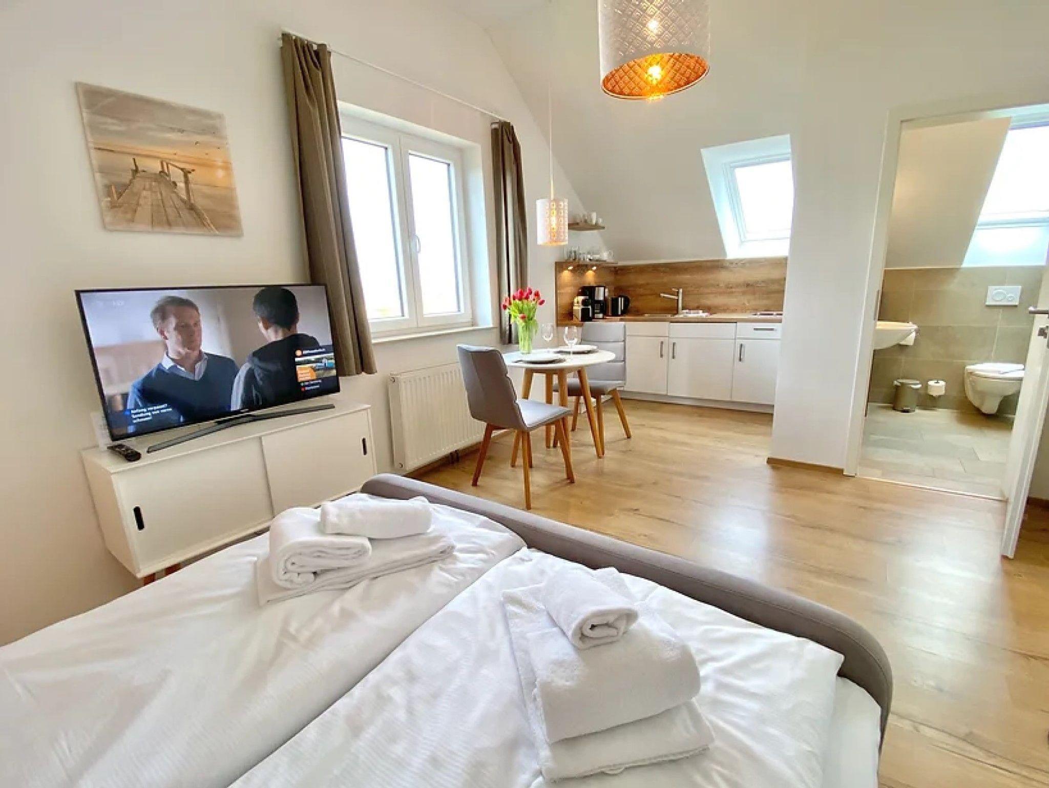 Das ca. 21-26 qm große Ferienstudio STANDARD befindet sich im Erdgeschoss oder Obergeschoss und bietet einen Blick auf den Jachthafen oder auf die Zicker Berge. Die Wohnung eignet sich für 1-2 Personen.