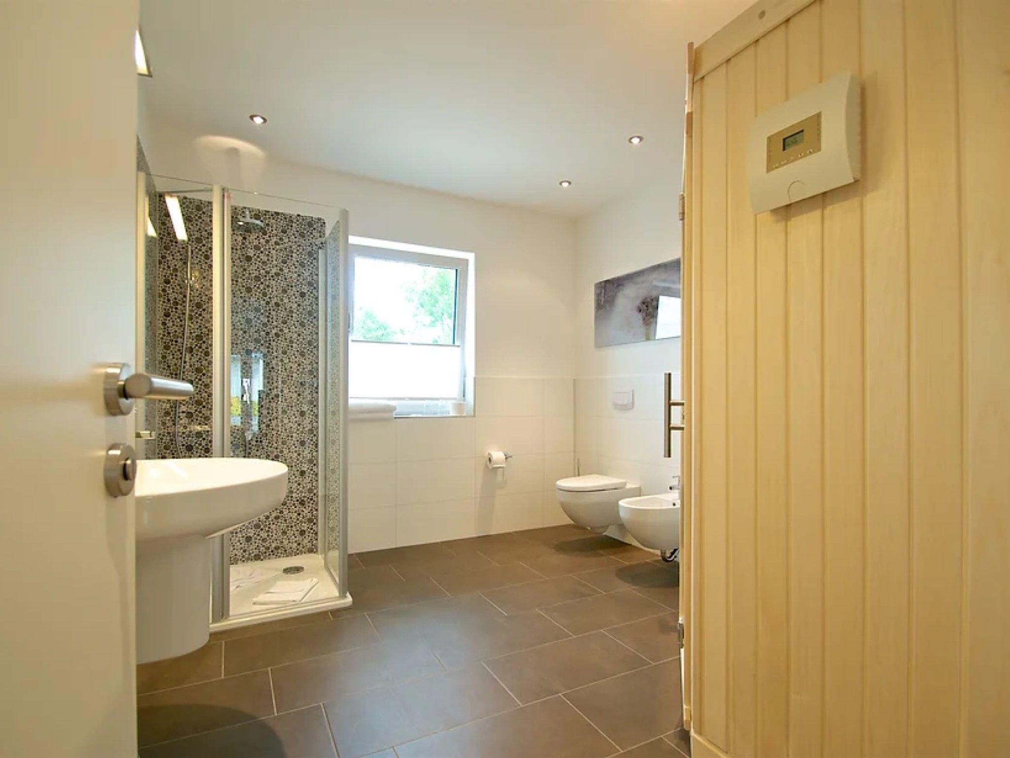 • Badezimmer (12 qm) mit ebenerdiger Dusche, Bidet, beheiztem Handtuchhalter, Fußbodenheizung und Tageslicht