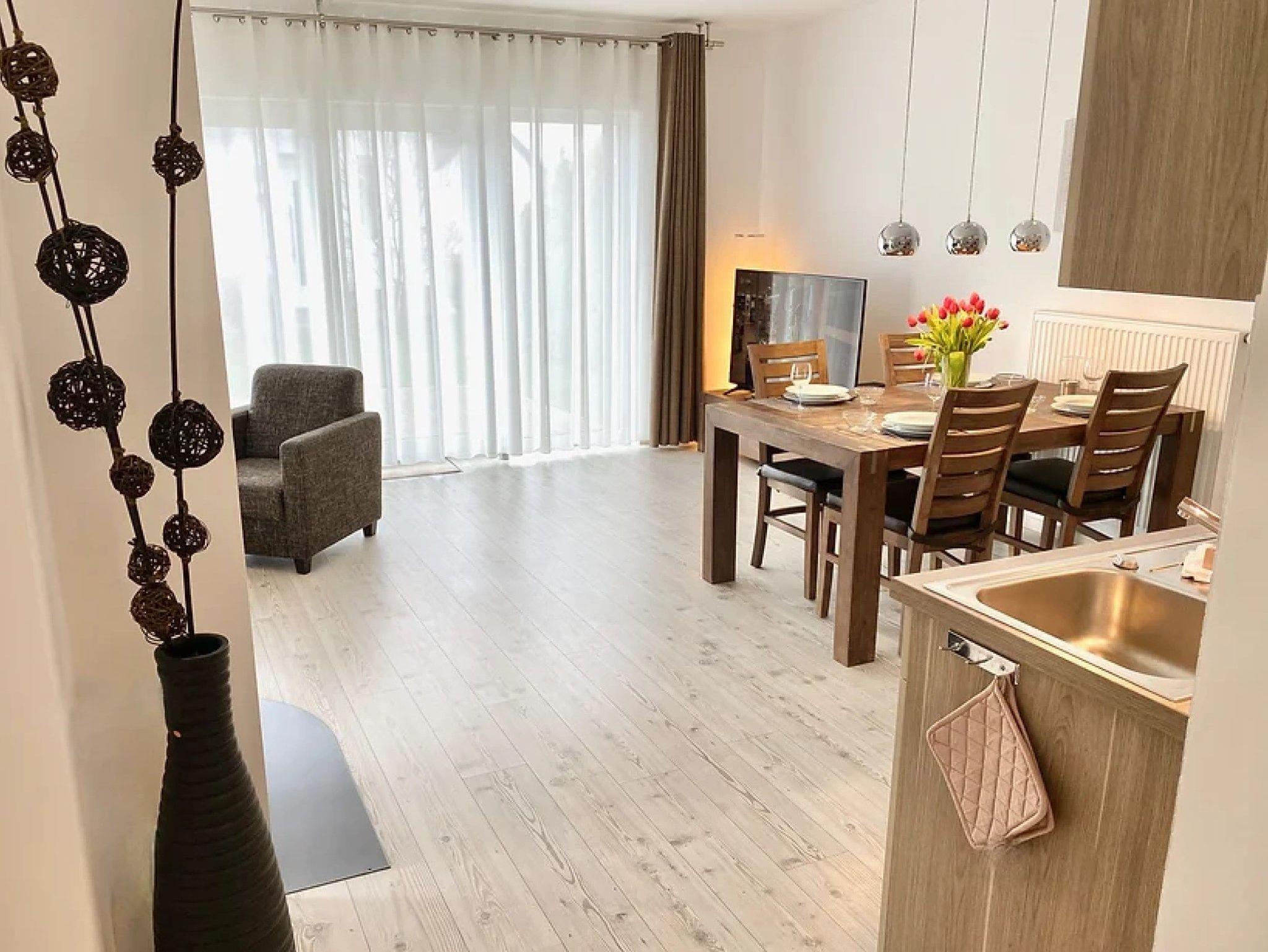 Die ca. 60 qm große 2-Zimmer Ferienwohnung DELUXE befindet sich im Erdgeschoss und bietet eine Terrasse mit eigenem Garten. Die Wohnung eignet sich für 1-2 Personen.
