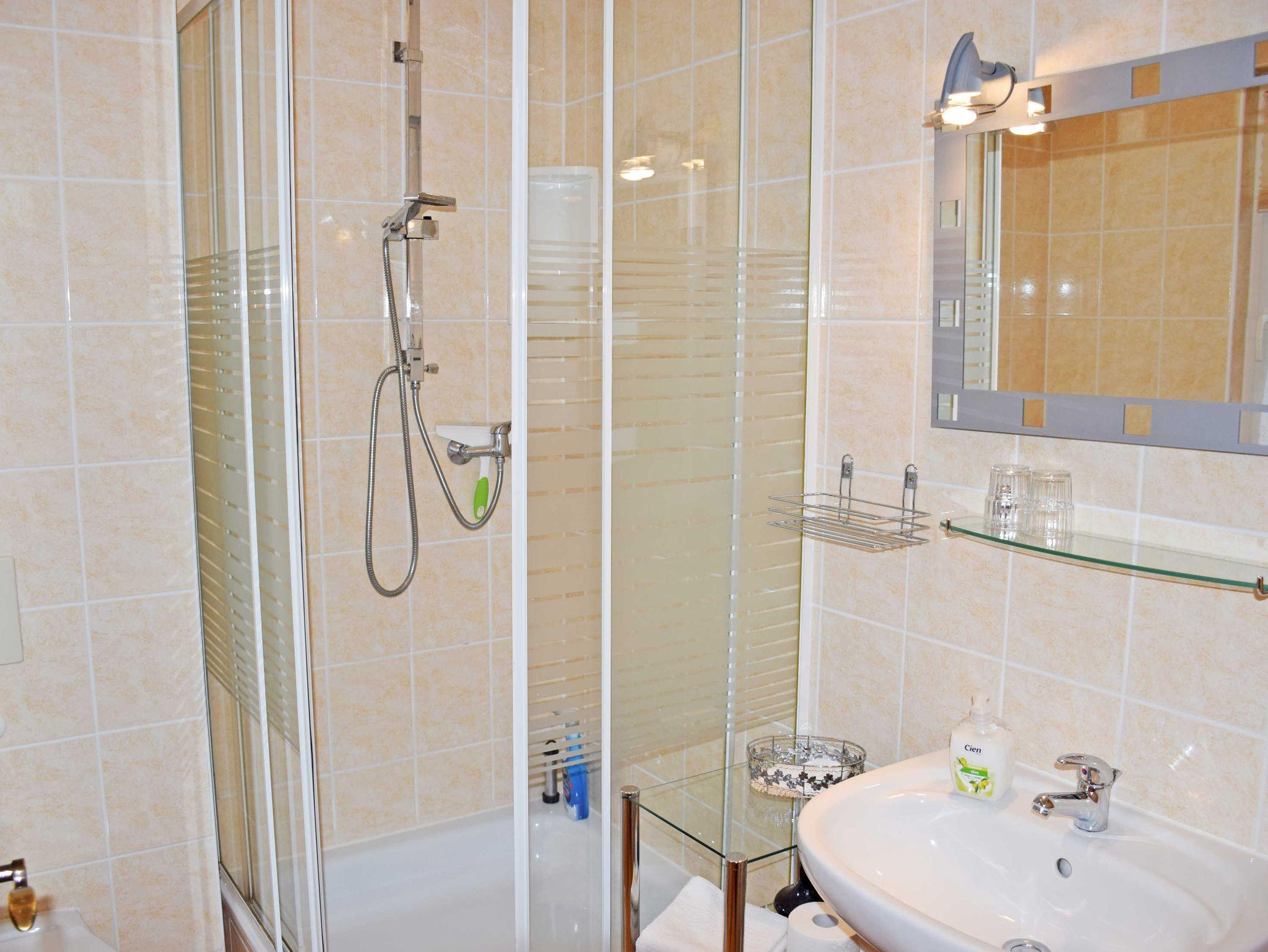 Das Schlafzimmer ist mit einem bequemen Doppelbett mit Nachttischen und Leselampen sowie einem Kleiderschrank ausgestattet. Das moderne Bad mit Tageslicht ist mit Dusche, WC und Waschtisch ausgestattet.