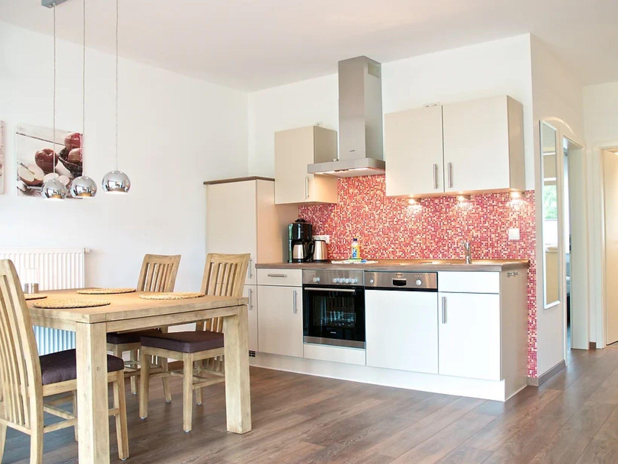 • Komplett ausgestattete Küchenzeile mit Geschirrspüler, Ceranfeld mit vier Platten, Backofen, Kühlschrank mit Gefrierfach und vielen Küchenutensilien