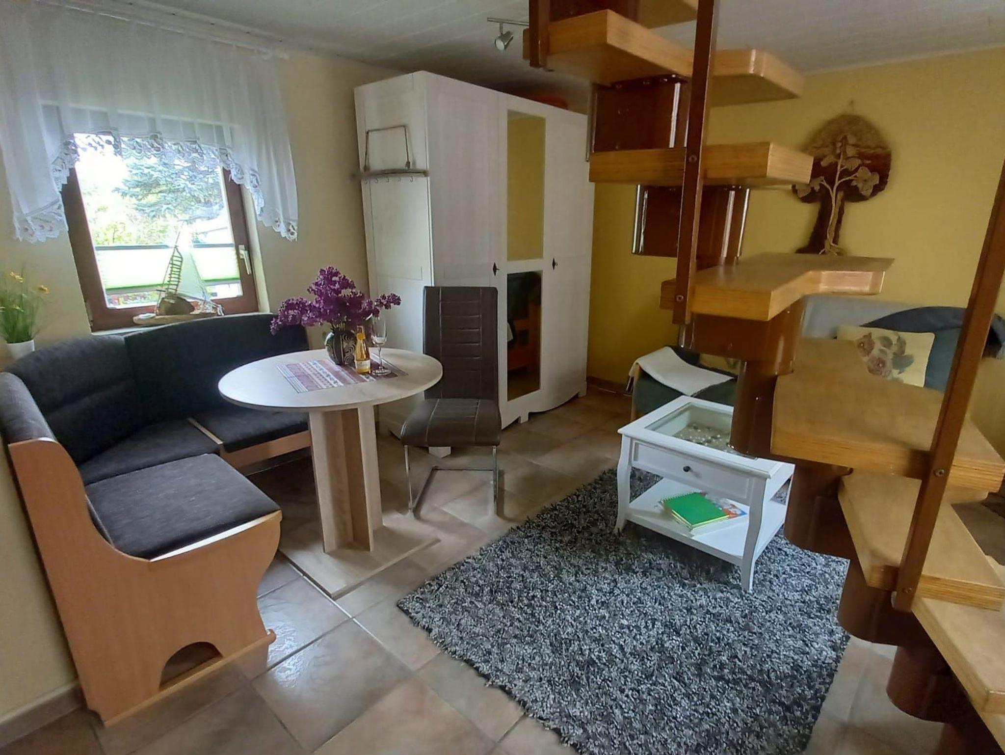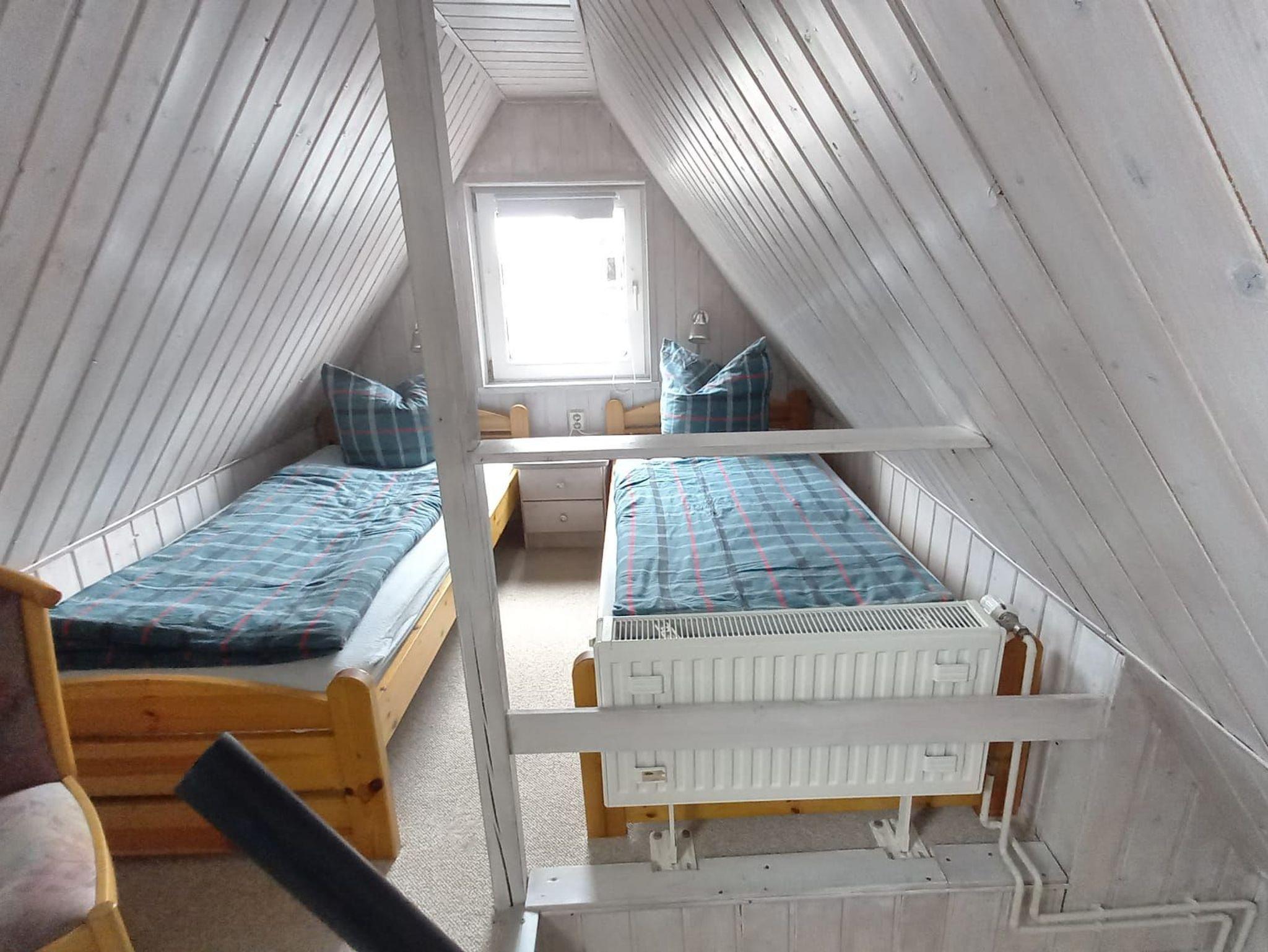 Das Ferienhaus verfügt in der unteren Etage über das gemülich eingerichtete Wohnzimmer mit der kleinen offenen Küche, Sowie dem Duschbad. In der oberen Etage, die über eine Raumspartreppe zu erreichen ist, befindet sich das Familienschlafzimmer mit 2 Doppelbetten.