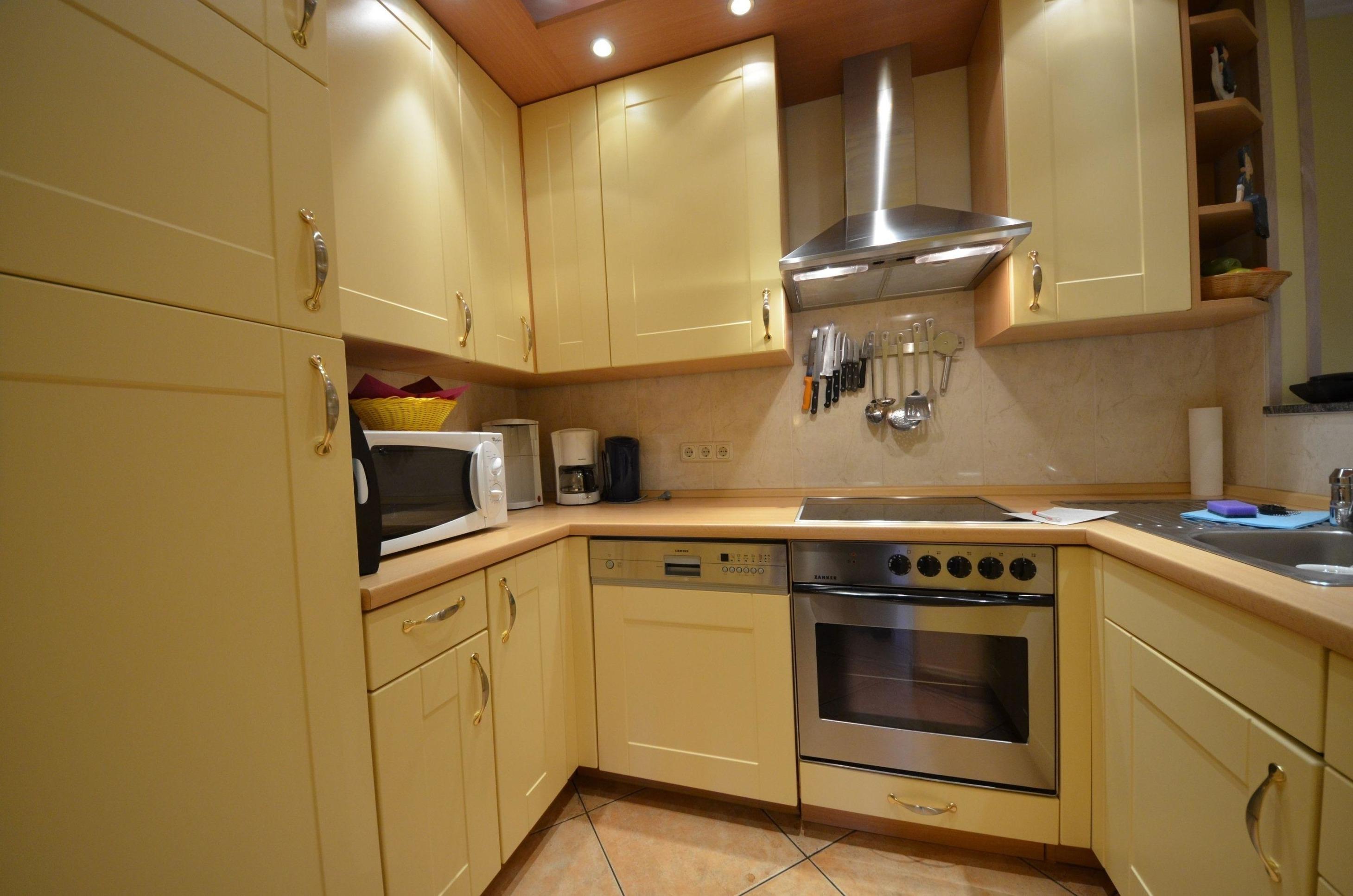 schöne vanillefarbene Landhaus-Einbauküche mit Geschirrspüler, Mikrowelle,
