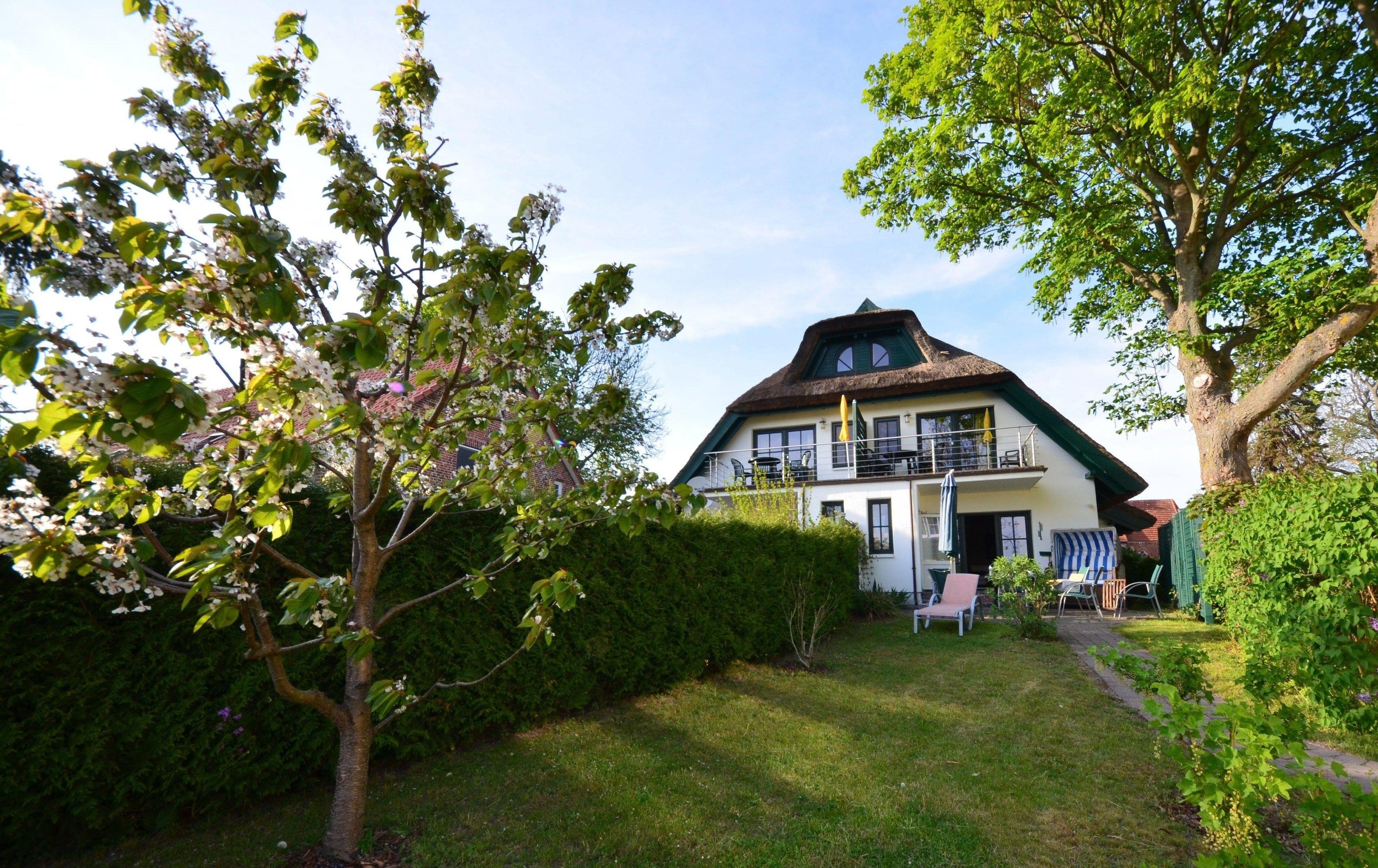 Das Haus hat eine Terrasse mit Gartenmöbeln, eigenem Gartenteil, Doppelstrandkorb