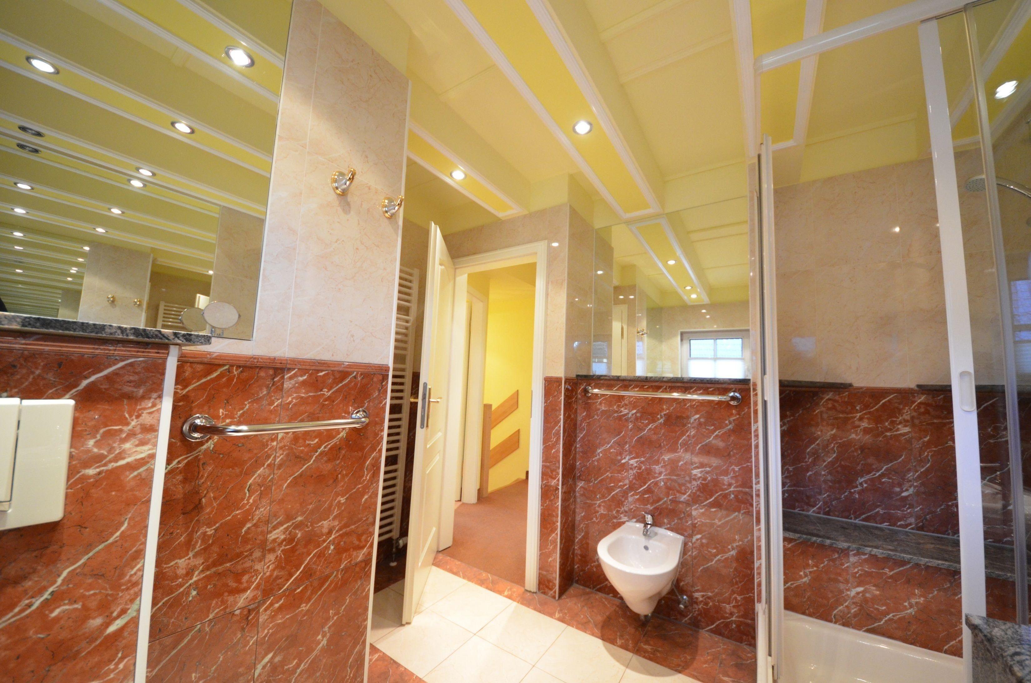 Fußbodenheizung, Naturstein - Abdeckungen, große Spiegel, schöne
