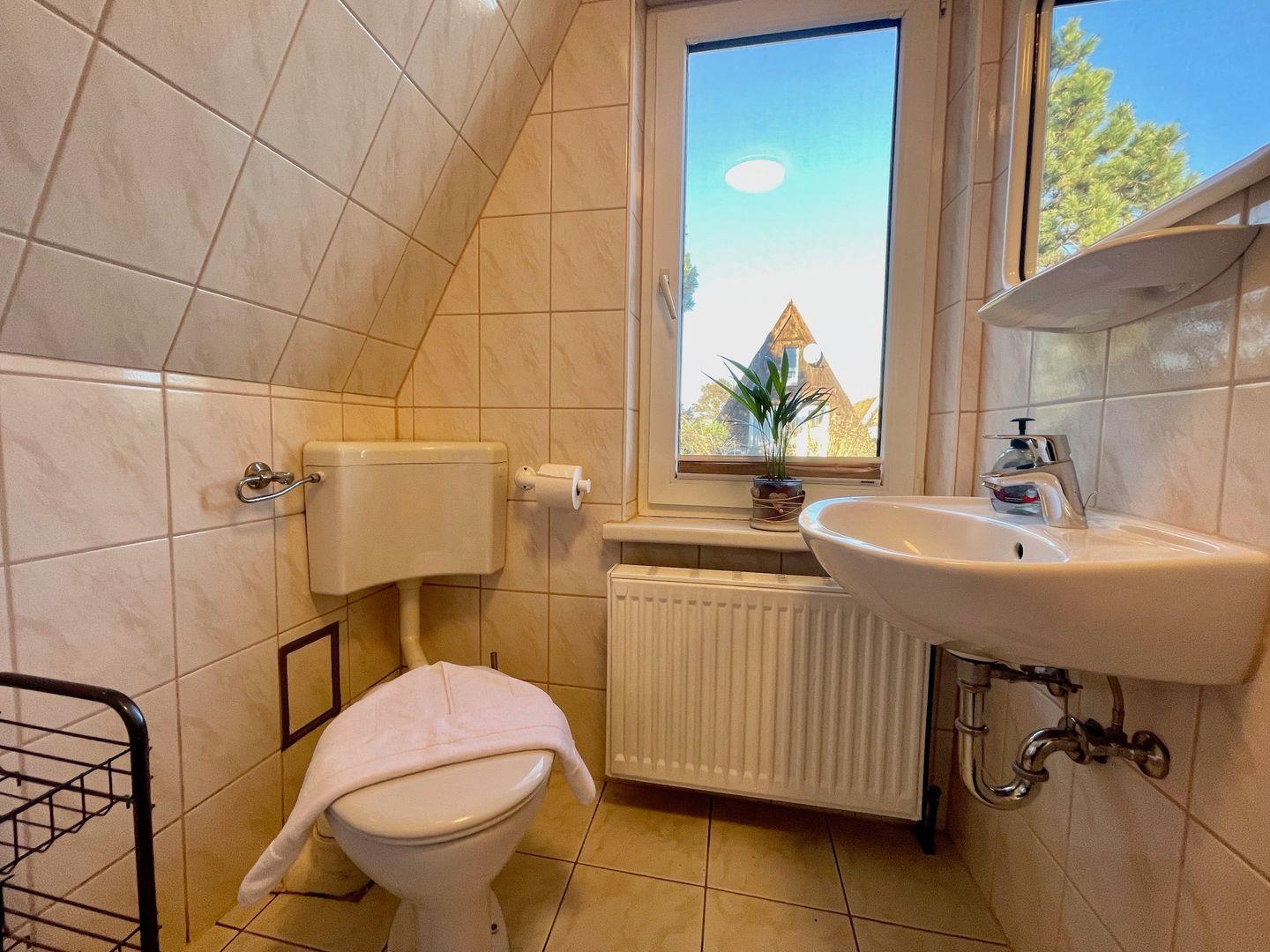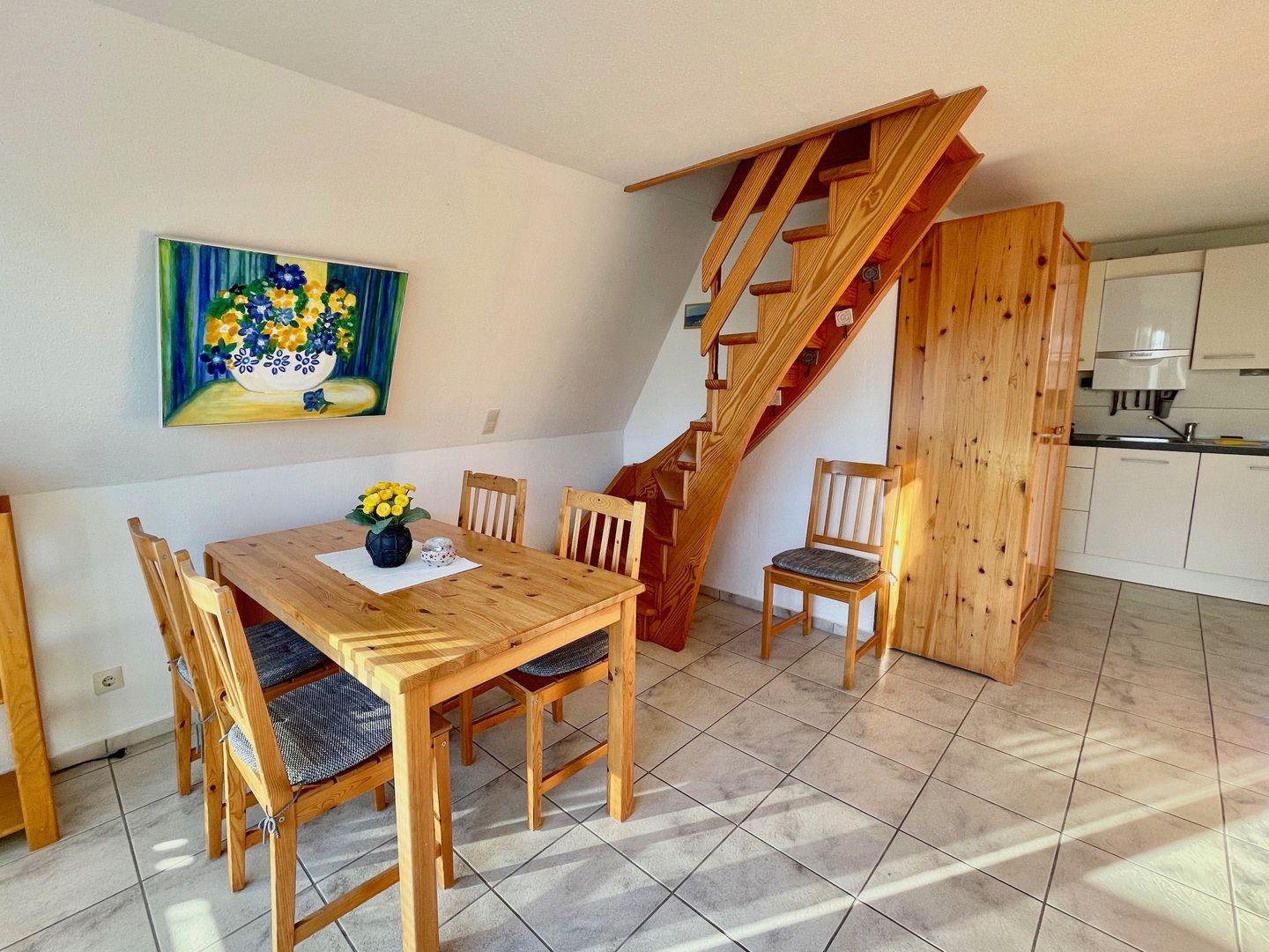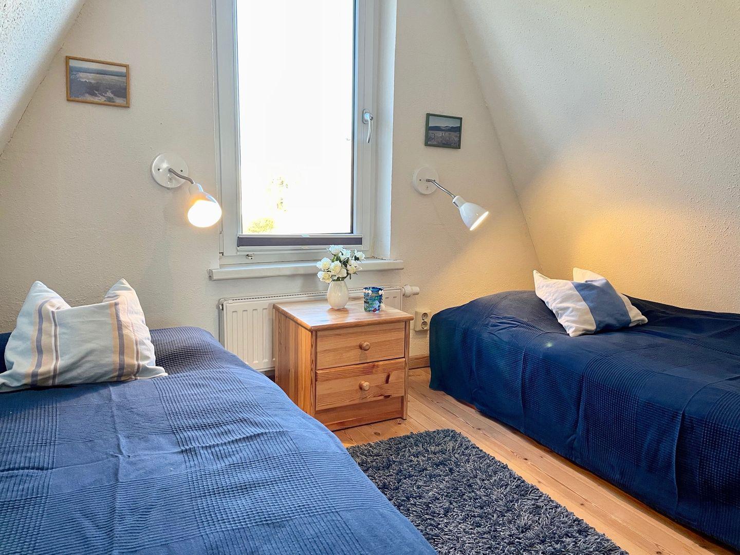 Über eine schmale Treppe gelangen Sie in den Schlafbereich im 1. OG. Hier befinden sich 2 Schlafzimmer mit Dachschrägen und je 2 Einzelbetten.