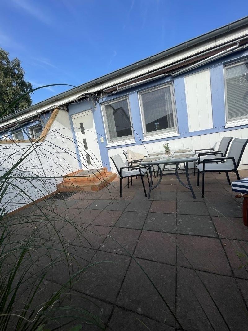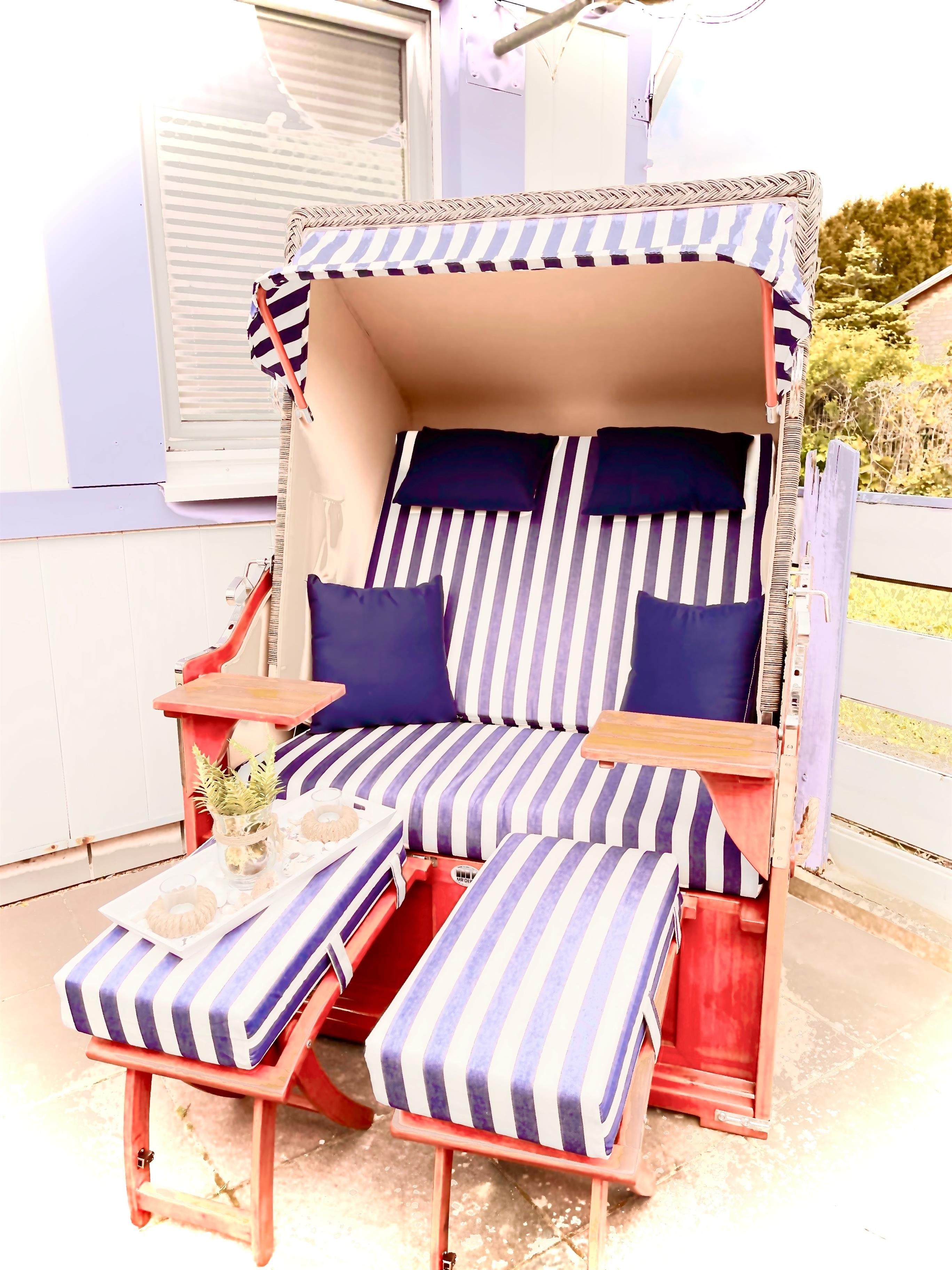 Die überdachte Terrasse mit einem Esstisch für 4 Personen und ein sehr schöner und gemütlicher Strandkorb und Grill laden zum relaxen ein.