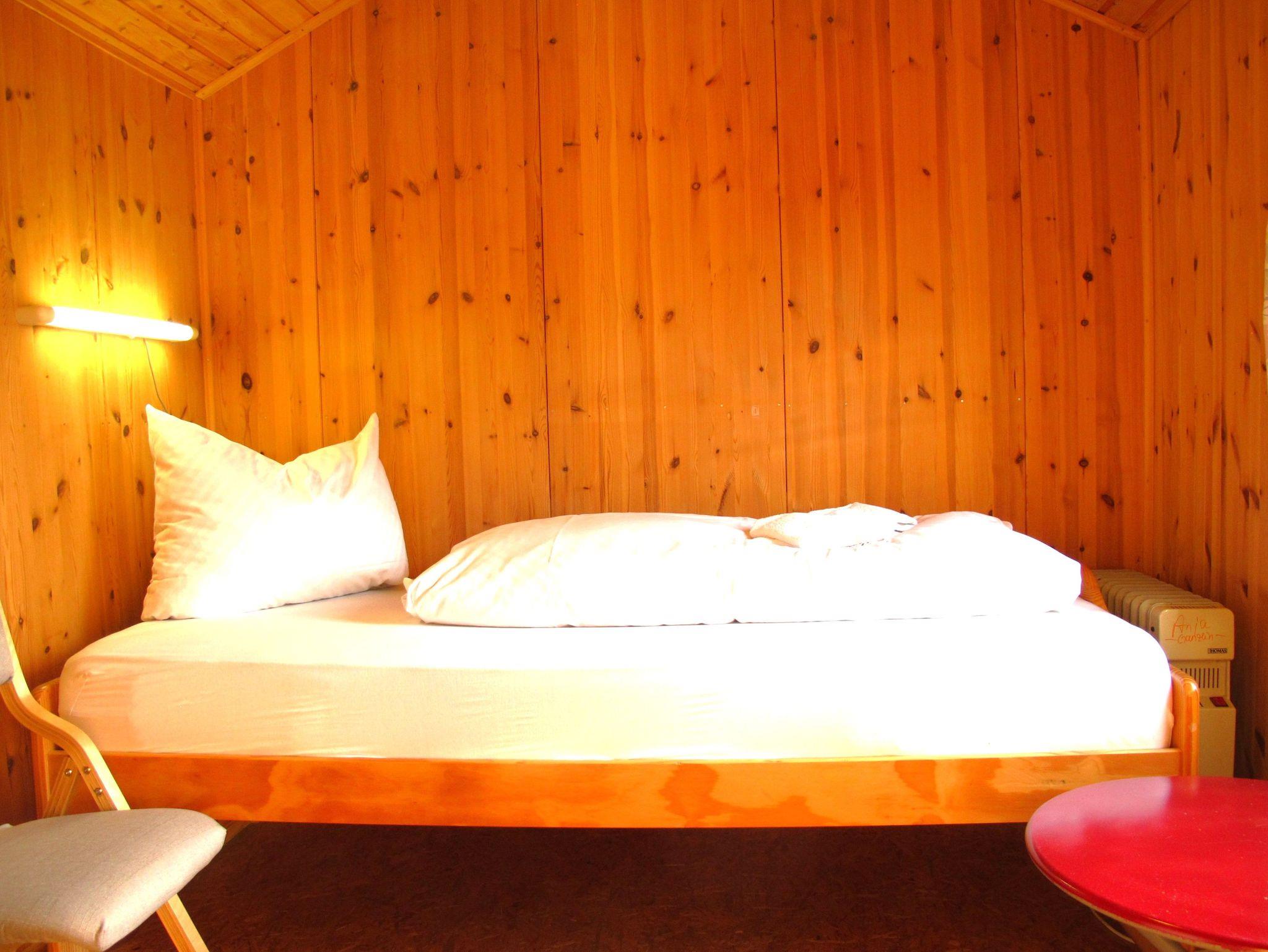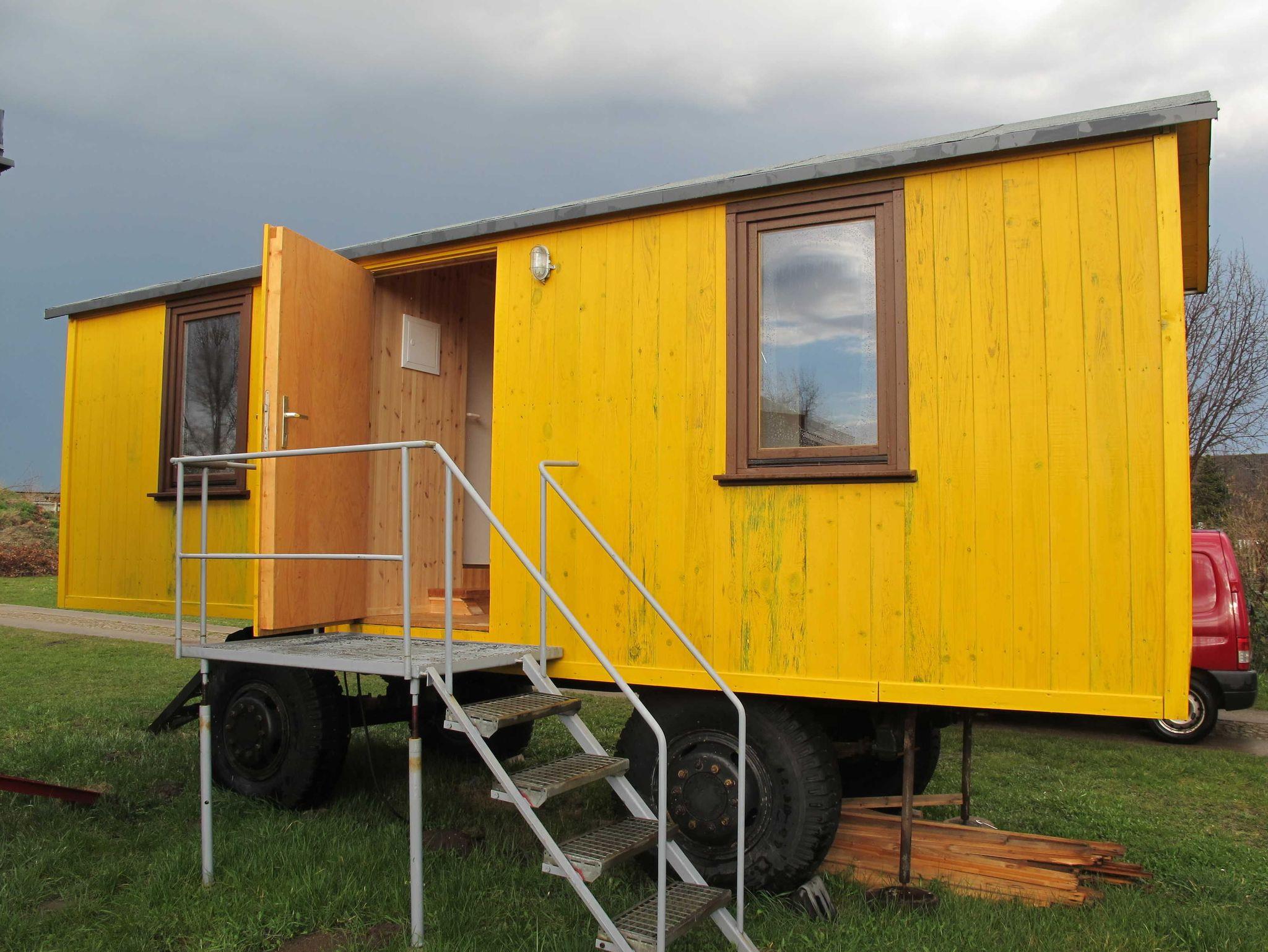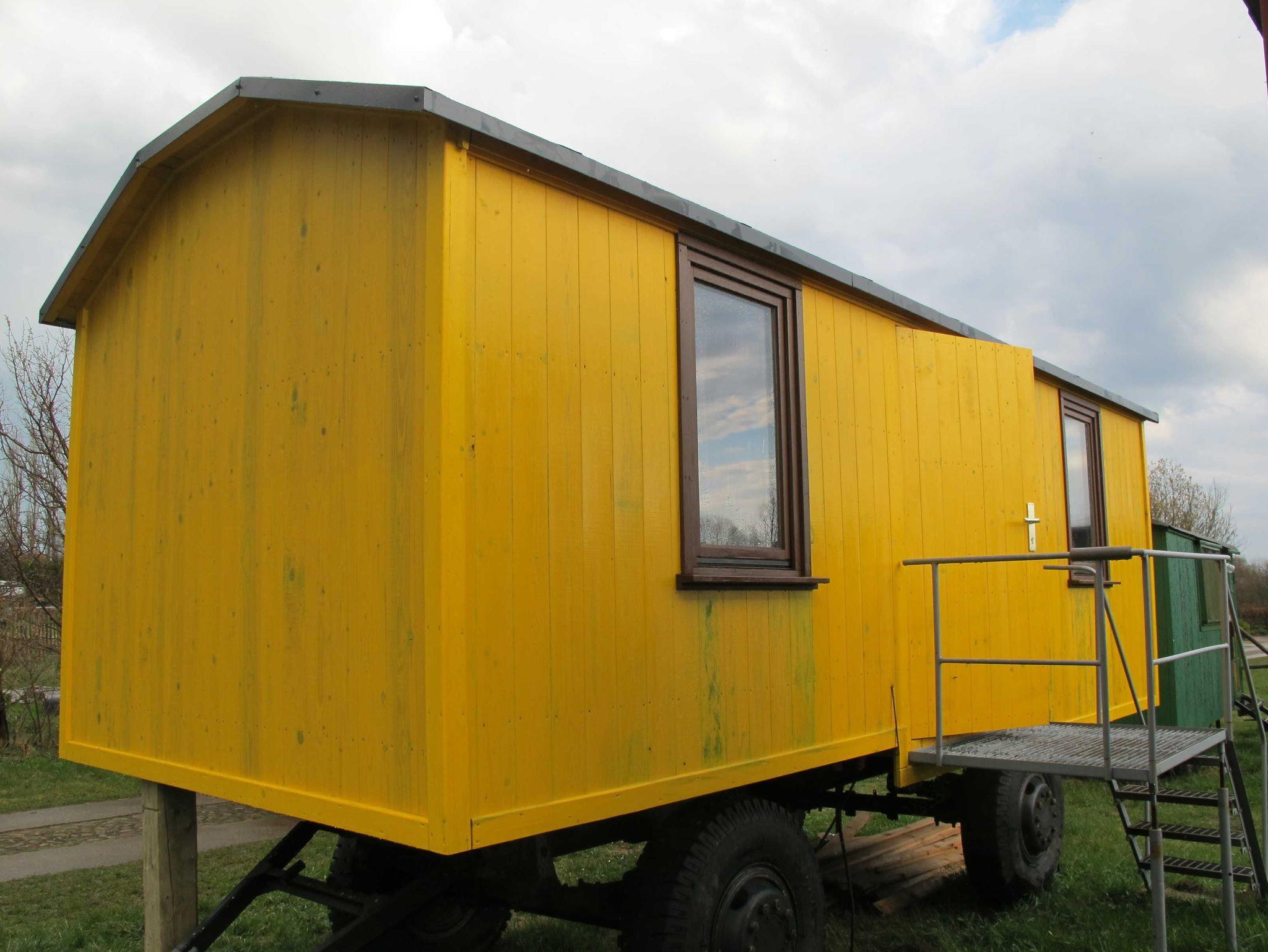 Unser Wohnwagen 2 (gelb) bietet zwei getrennte Räume, wobei der rechte Raum als Einzelzimmer gemietet werden kann. Der Wohnwagen ist einfach ausgestattet und mit einem Radiator beheizbar.