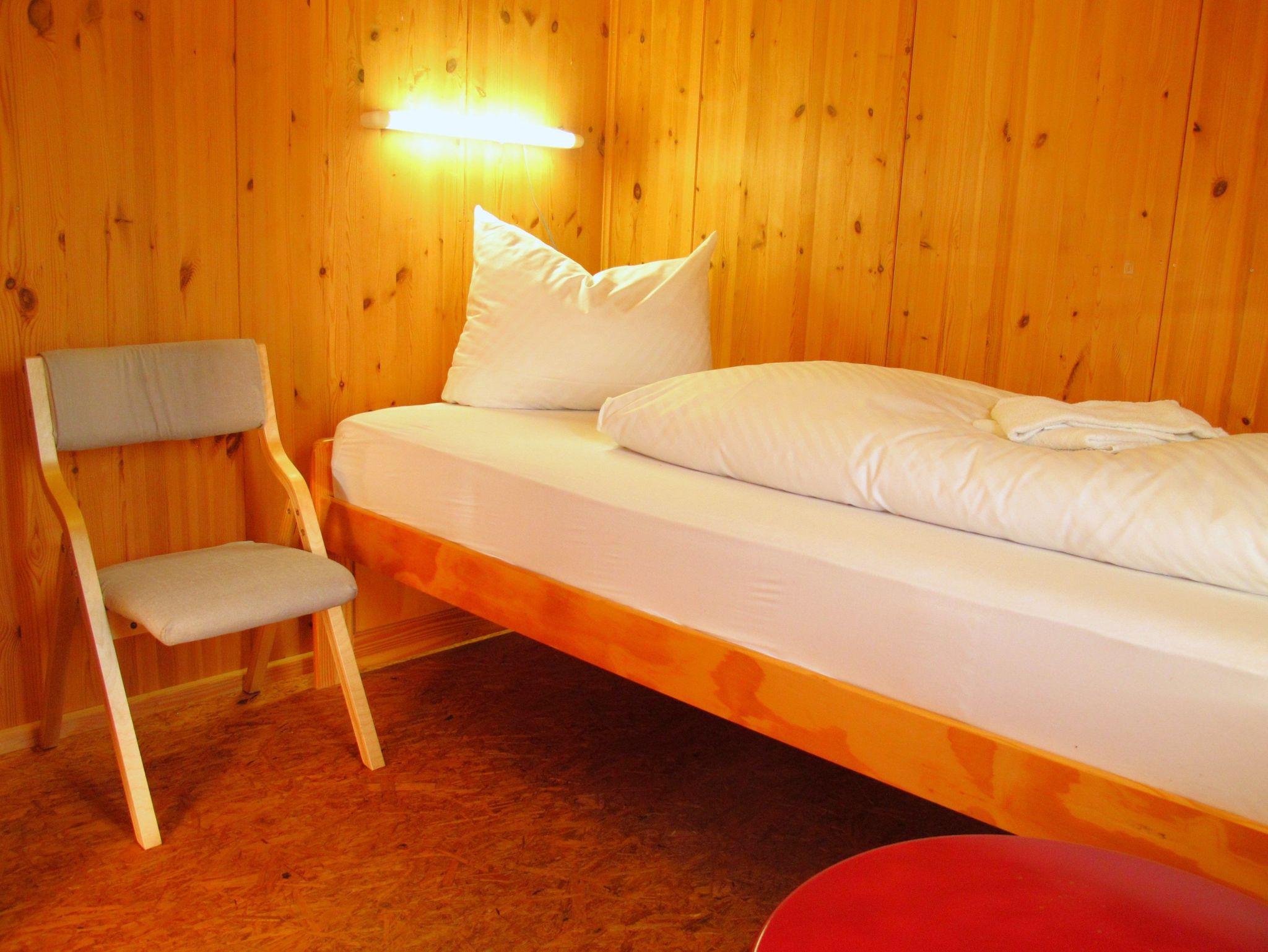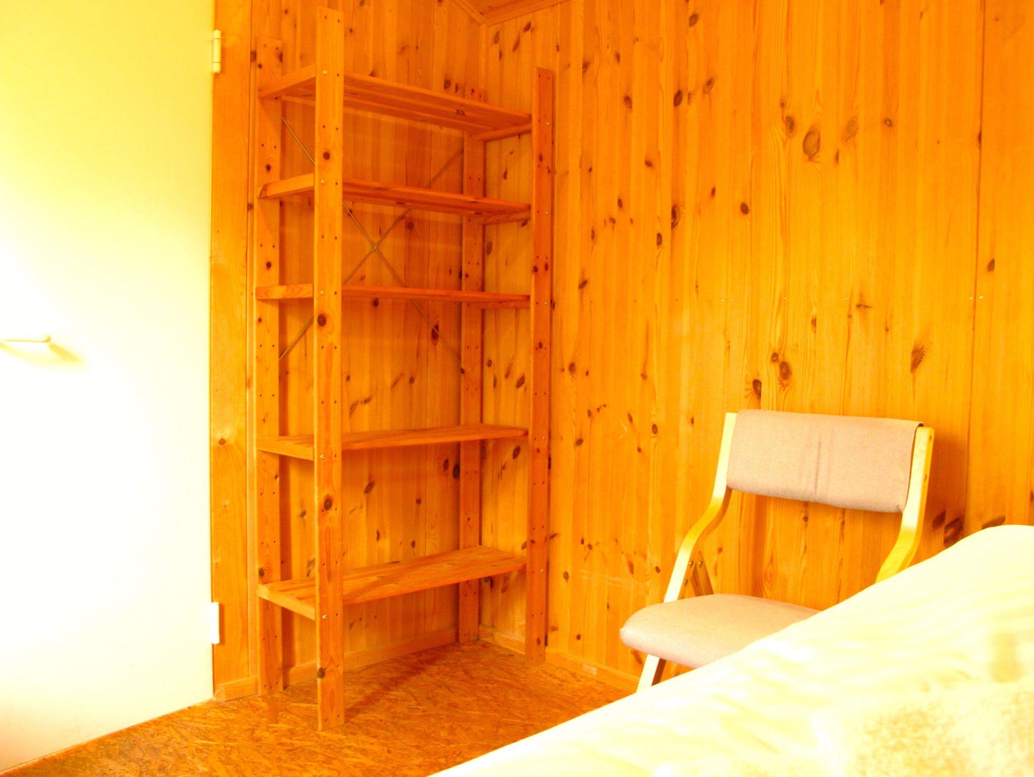 Das rechte Zimmer ist ca. 6 m² groß und mit 1 Einzelbett ausgestattet. Außer dem Bett befinden sich zwei Stühle, ein Tisch und ein großes Regal im Raum. Handtücher und Bettwäsche sind inklusive.