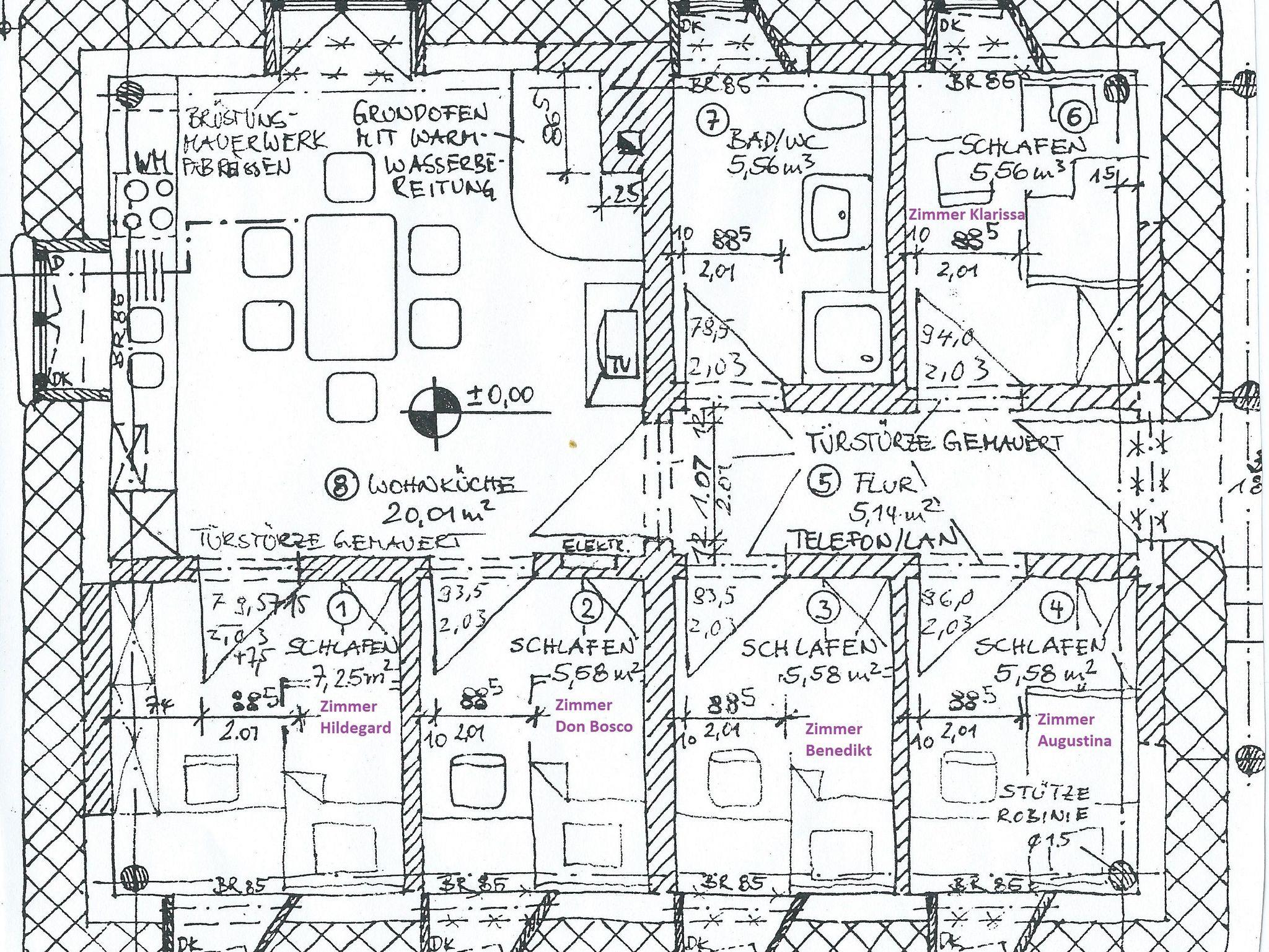 In der Gemeinschaftsküche des Klosters können Sie sich verpflegen. Auch das Badezimmer mit dem Badeofen wird gemeinschaftlich genutzt. Wichtig: Der Badeofen muss selbst angeheizt werden, das Holz dafür wird gestellt. Für warmes Wasser zum Duschen sollte er ca. 20 Min. vorher in Betrieb genommen werden.
