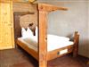 Das Doppelbett (160 x 200 cm) wurde von einem Holzgestalter aus Teilen uralter Webstühle, in Kombination mit Metall und Stein, von Hand gefertigt.