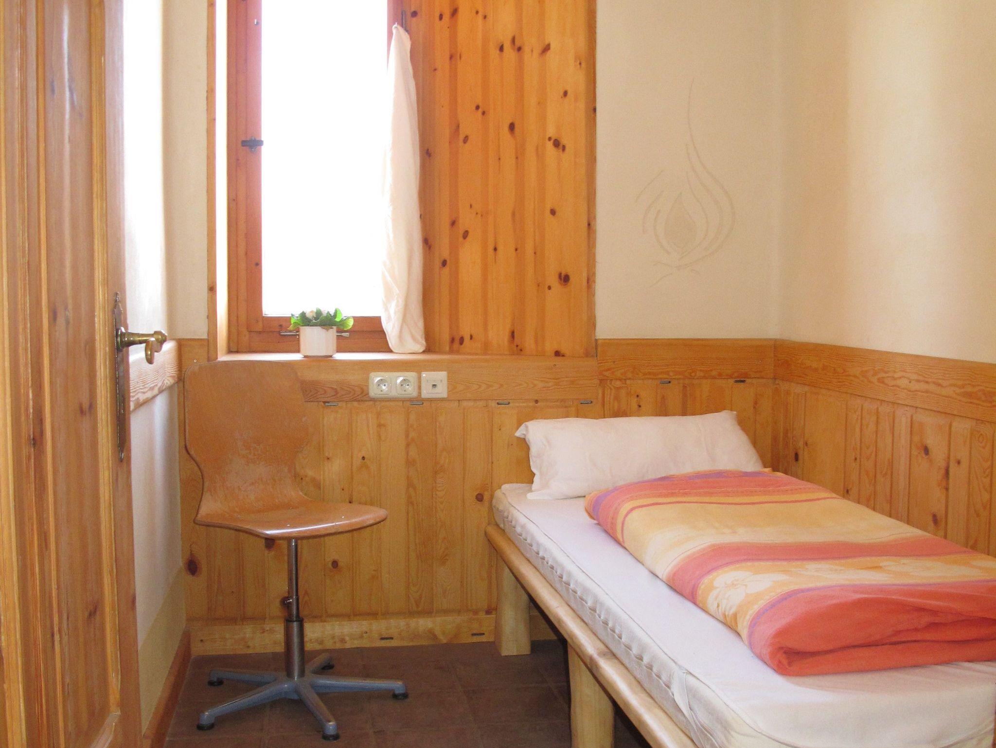 Unser Einzelzimmer Hildegard für eine Person ist ca. 7 m² groß. Eingerichtet ist es ganz klösterlich mit einem Einzelbett (90x200 cm), einem Schrank und einem Stuhl.