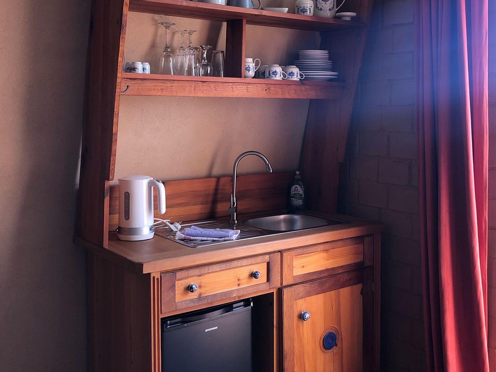 In der integrierten Mini-Küche können Sie Ihr Frühstück zubereiten. Kühlschrank, Wasserkocher, Toaster und Geschirr sind vorhanden. Leider steht aus Sicherheitsgründen keine eigene Kochplatte zur Verfügung. Allerdings öffnen wir von Mai bis Oktober zusätzlich die auf dem Gelände befindliche Sommerküche für Gäste, die in ihrer Unterkunft keine Kochmöglichkeit haben. In der Sommerküche befinden sich eine voll ausgestattete Küche und weitere Sitzmöglichkeiten.